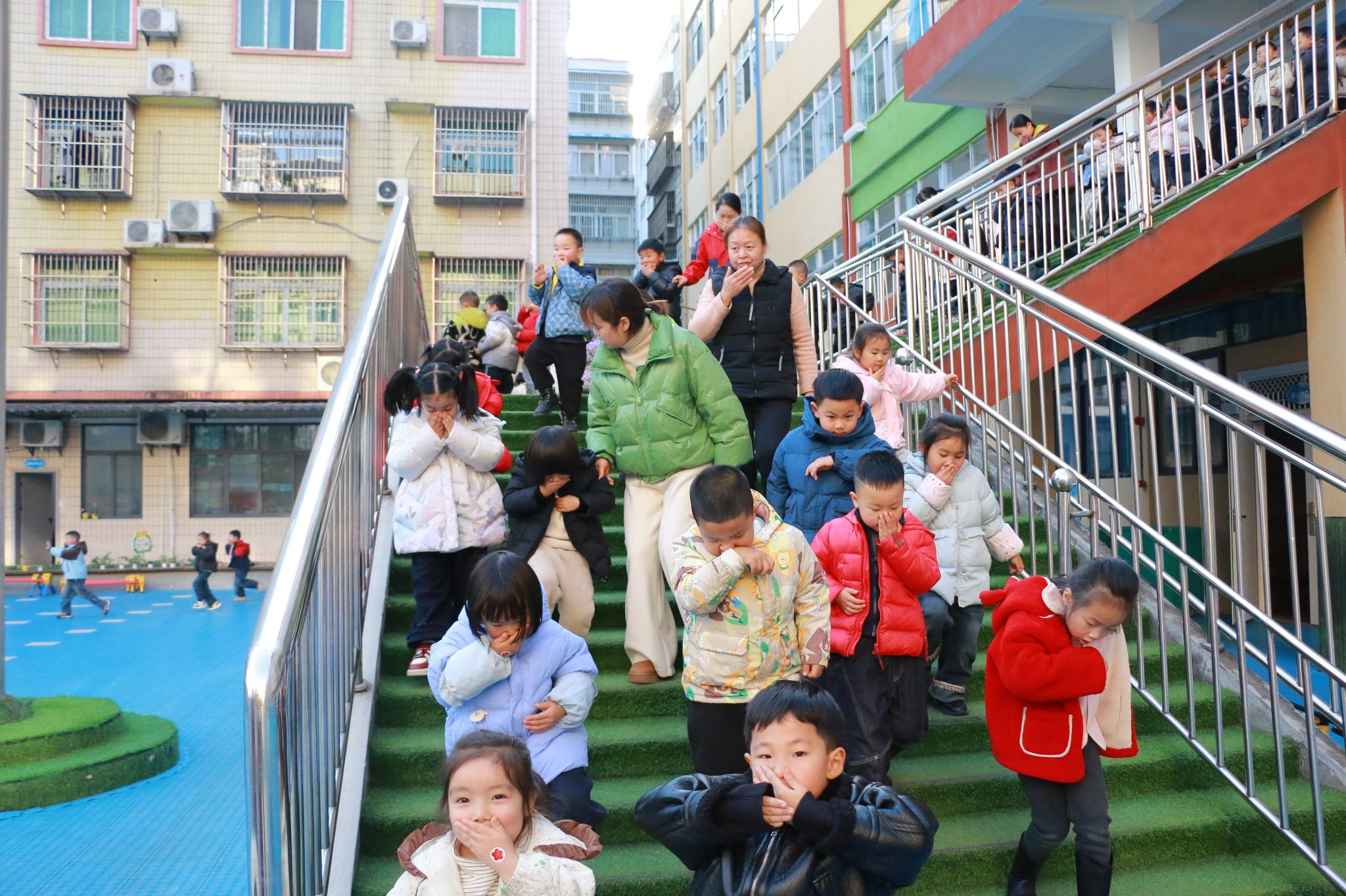 下午,急促的火灾警报声毫无预警地在园内响起。面对“突发状况”,全园迅速启动应急响应机制,各班教师立即中止当前活动,沉着指挥幼儿进入疏散程序。孩子们在老师引导下,迅速用衣袖捂住口鼻,低姿弯腰,沿指定疏散路线快速、有序撤离到安全区域——园操场。关键通道及楼梯转角处,安全引导员均已就位,有效维持秩序,严防发生拥挤踩踏,整个疏散过程紧张而不慌乱,用时短、效率高。