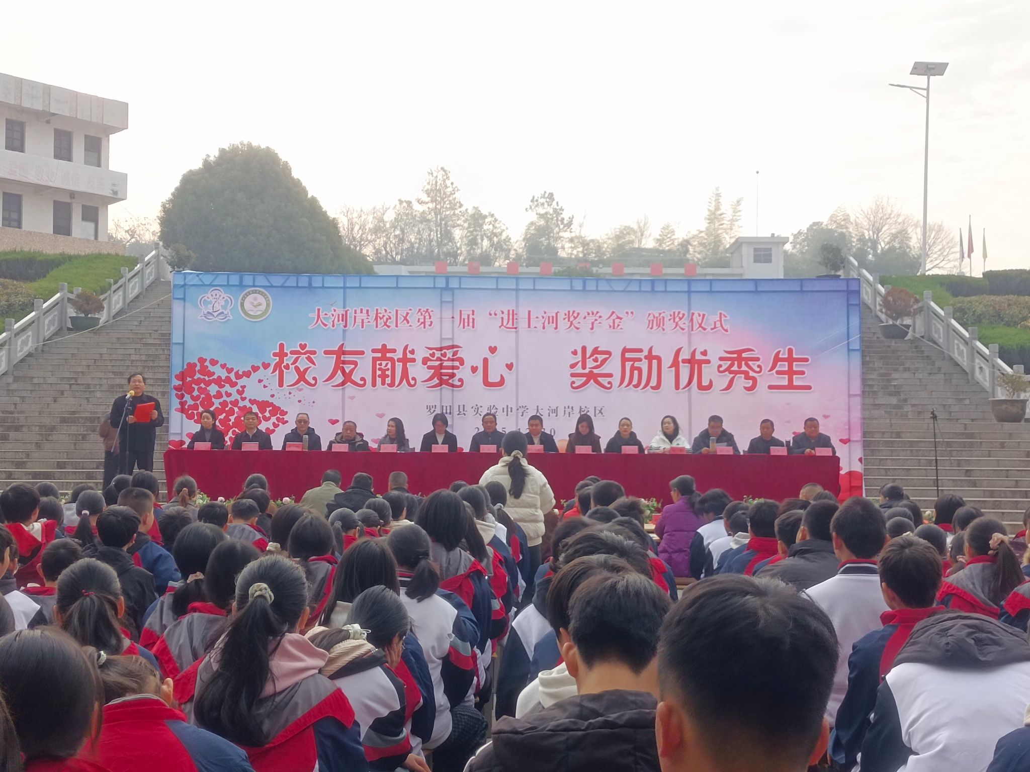 经过一年多的策划与动员,在各级领导的高度重视和校友们的热情参与、鼎力支持下,罗田县实验中学大河岸校区(原罗田县大河岸中学)“进士河奖学基金”正式成立。基金旨在激励学子奋发向上、成长成才。12月30日,罗田县实验中学大河岸校区第一届“进士河奖学金”颁奖仪式举行。罗田县关工委副主任、二级调研员汪福平,大河岸镇党委书记饶喻航,罗田县红十字会党组成员、秘书长夏盈,大河岸镇党委宣传委员罗曼等领导;校友代表、 获奖学生家长代表、该校区全体师生参加。