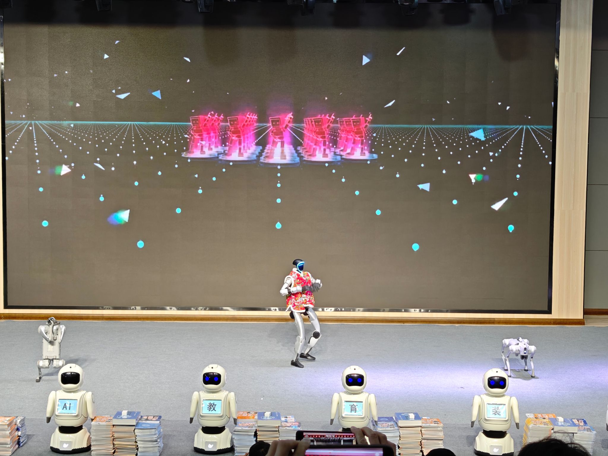 仪式现场,凯丰公司带来了精彩的机器人表演,灵动的机械舞姿赢得了在场师生的阵阵掌声。爱宾果公司代表伍诗奕还对智慧光设备进行了详细介绍,让大家直观感受到人工智能技术在教育场景中的应用价值。