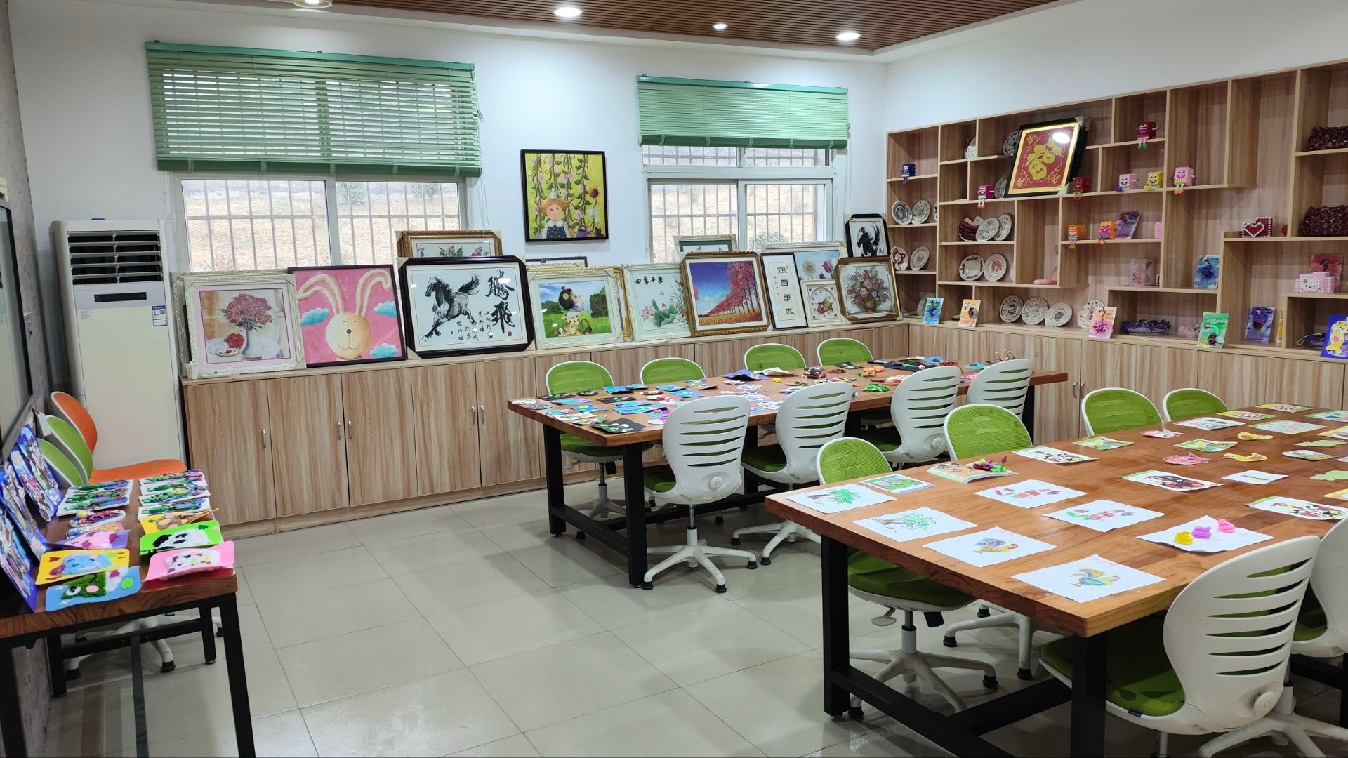走进学校的美育展示室,暖黄色的灯光下,墙面与展架上错落陈列着孩子们的作品:憨态可掬的彩泥动物、色彩明艳的植物水彩画、线条质朴却充满童趣的卡通插画,还有融入传统元素的剪纸、拼贴画——其中一幅《腾飞》主题的奔马图,笔触虽显生涩,却将骏马的昂扬姿态勾勒得格外生动,落款处的名字旁,还贴着老师手写的评语:“你笔下的马,有风的样子”。