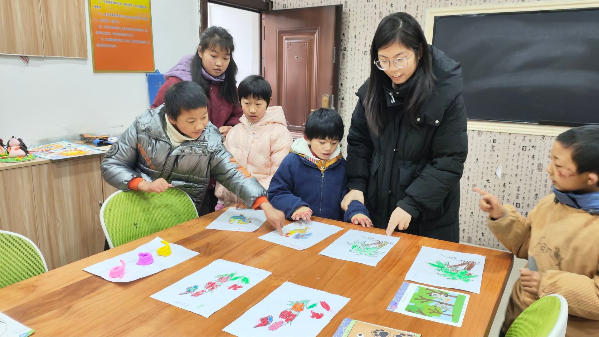 展示现场,几位老师正带着学生们围在作品前交流,一位学生指着一个作品,惊喜地说道:“这是我画的公鸡!”身旁的美术老师笑着说:“这是他上周用一个下午画成的,从最开始的歪歪扭扭,到最后的有模有样,每一步都是惊喜。”而在手工区,家长李女士看着孩子的剪纸作品红了眼眶:“以前总觉得他‘慢半拍’,今天才发现,他的世界里藏着这么多漂亮的颜色。”