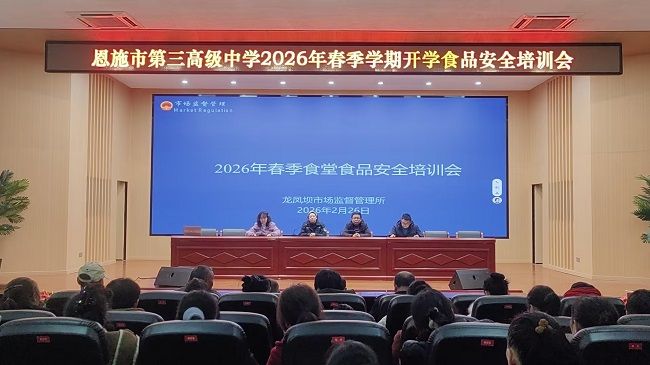2月26日,恩施市第三高级中学召开2026年春季学期开学食品安全培训会。恩施市龙凤镇市场监督管理所专家、学校相关负责人及全体食堂员工参加会议。