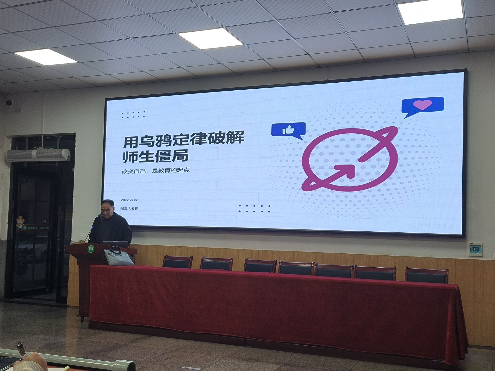 活动中,刘校长制作了精美的PPT课件,结合教育教学实际,生动解读“乌鸦定律”的核心内涵,通过寓言故事引申教育启示,强调教育者应摒弃“抱怨学生、外归因问题”的思维,像乌鸦顿悟改变自身那样,主动反思教学行为、调整沟通方式,以自身改变带动师生关系改善。分享中,还结合校园常见的师生沟通案例,分析当前部分教师在教育中存在的挑错式教育、单向说教等误区,分享了运用“乌鸦定律”化解师生矛盾的实操方法,引导教师学会情绪管控、倾听学生心声、挖掘学生闪光点,以包容与共情搭建和谐师生桥梁。