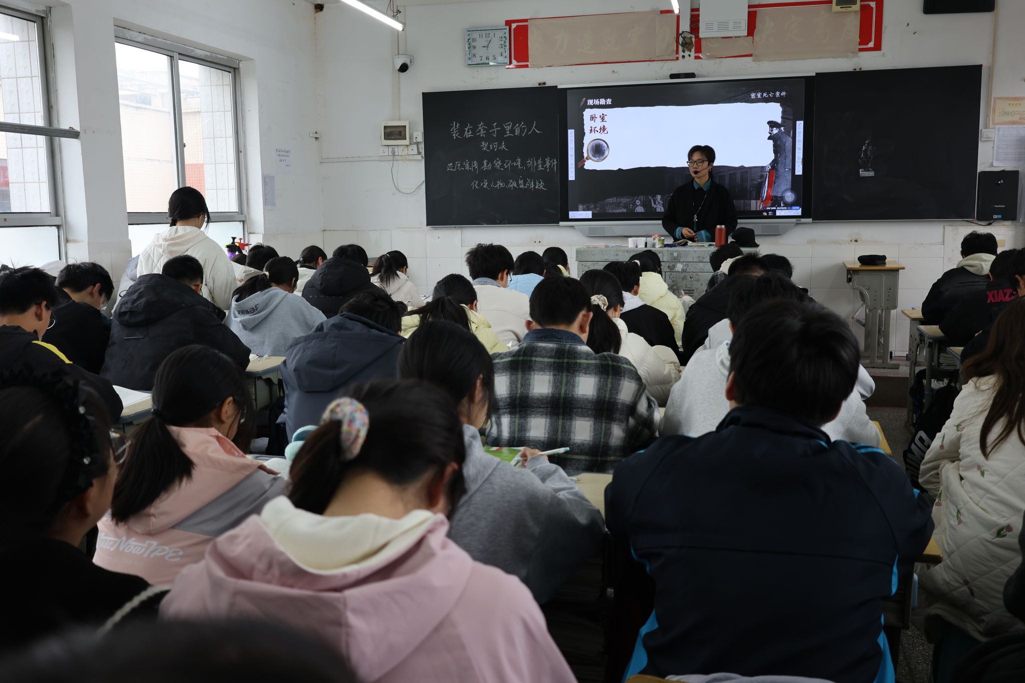 围绕《装在套子里的人》,房县二中周晓晓老师以情境探究 + 任务驱动 + AI 赋能为核心,通过创设时代背景情境、设置人物分析任务、借助 AI 工具辅助文本解读,引导学生深挖别里科夫 “套子” 的深层内涵,聚焦人物形象、社会根源与现实意义,课堂互动充分、学生参与度高,落实文学鉴赏与思辨能力培养。房县一中唐冲老师则立足文本细读 + 问题链引导 + 深度思辨,紧扣小说细节、人物语言与行为展开剖析,层层递进引导学生理解人物悲剧的社会根源,注重学生思维训练与文本深度解读,课堂沉稳扎实、逻辑清晰,呈现出风格迥异却同样高效的优质课堂。