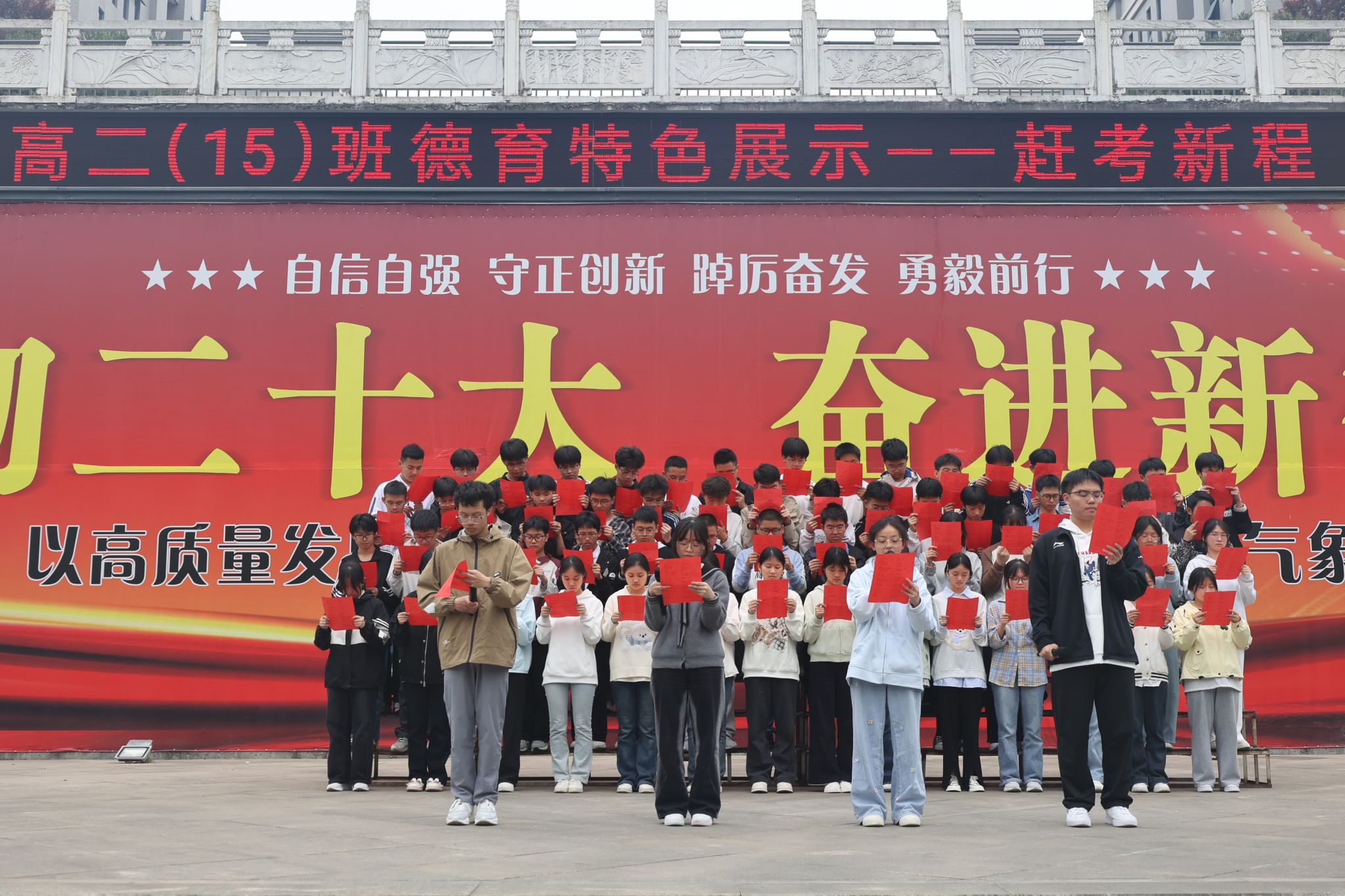 “请历史见证,我们不忘初心;请时代见证,我们奋勇前行……”第四篇章“誓言·未来之诺”将整场展示推向高潮。同学们依次立下誓言,以青春之名作出庄严承诺,全班齐声高呼“赶考新程,少年担当”“强国有我,未来可期”,最后反复呐喊“请党放心,强国有我”,誓言铿锵、气势磅礴,尽显青年学子的责任与信念。伴随着《勇往直前》的激昂旋律,同学们以昂扬姿态、坚定信念,为本次德育展示画上圆满句号。