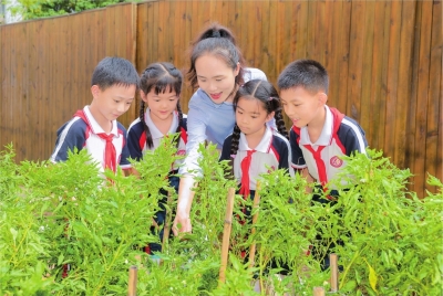 在钢花小学“半亩花田”里,老师正带领着三年级的学生观察辣椒植株,记录生长情况。