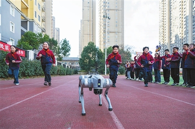 日前,在安徽省合肥市庐阳区六安路小学荣城花园分校,小学生正在与机器狗互动赛跑。 赵明 摄