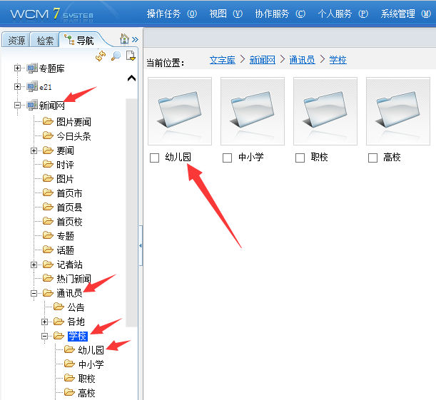 登陆后,可以直接在看到“新闻网”,双击依次打开“新闻网”—“通讯员”—“各地”或者“学校”(根据用户身份选择,学校用户选择“学校”,县级用户选择“各地”)—……一直点击到达最后一页(如图七)。