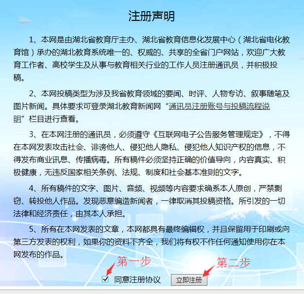 点击“用户注册”、阅读“注册申明”并同意,如图一、图二。