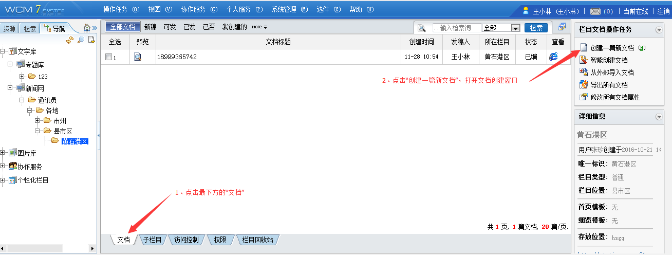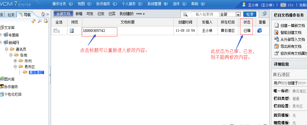(6)修改文档:双击文档标题,可以重新进入该文档进行编辑。如果文章状态已经是“已审”、“已发”的文章不能再进行编辑。(如图十二)