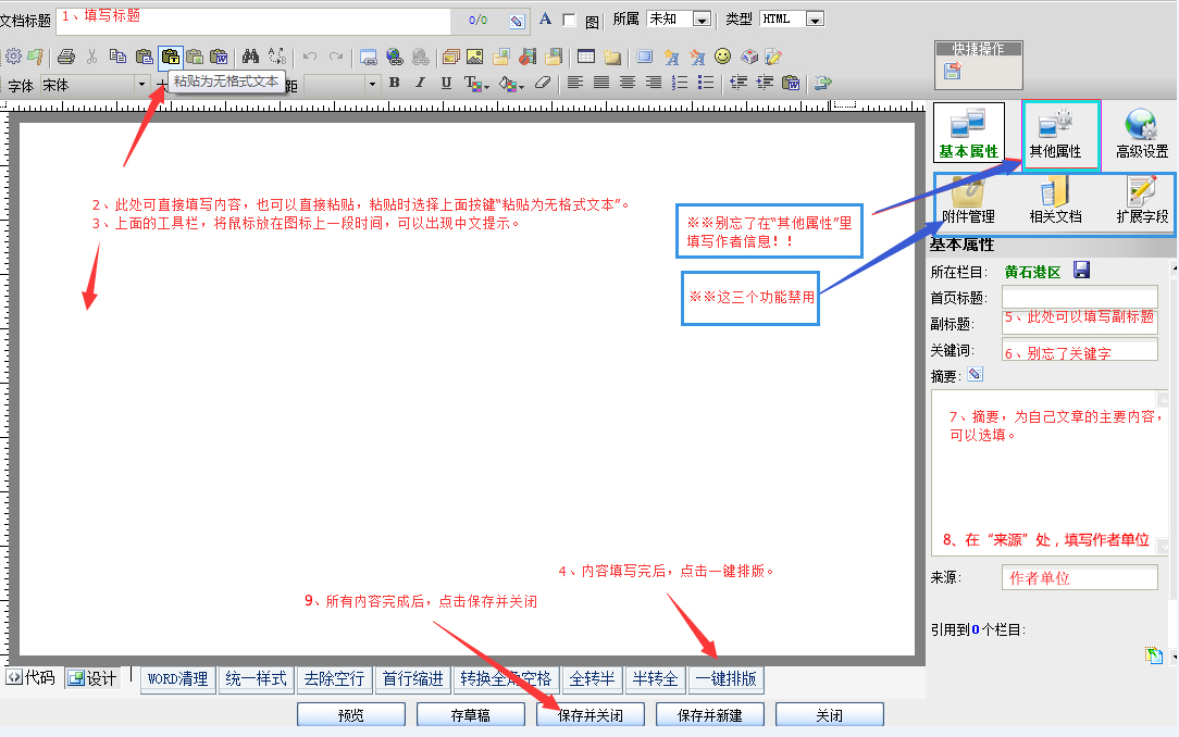 (2)填文章内容:填写标题—填充内容—填关键词—填摘要—填来源;