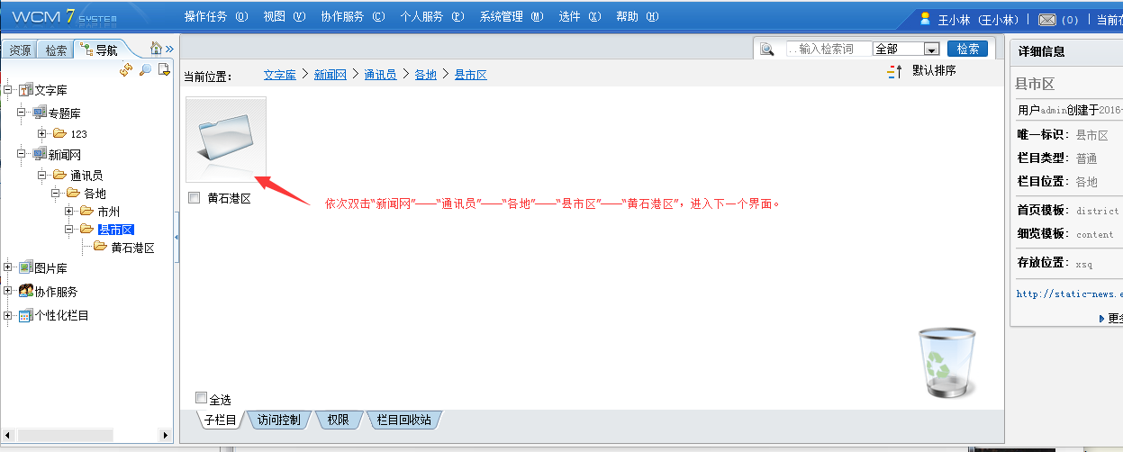 如果是县级教育管理部门通讯员“黄石_黄石港_王小林”,登录后,依次双击打开“新闻网”—“通讯员”—“各地”—“县市”—“黄石港区”,进入最终空白页面(如图八)。
