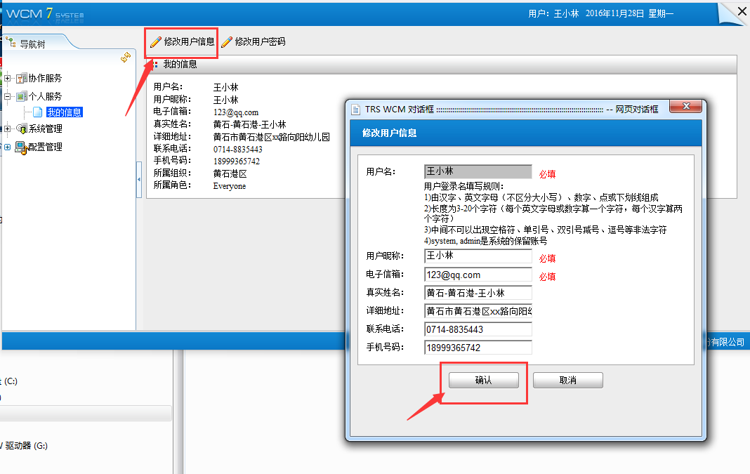 点击“个人服务”—“我的信息”—“修改用户信息”/“修改密码”,修改相关信息。如图五、图六。