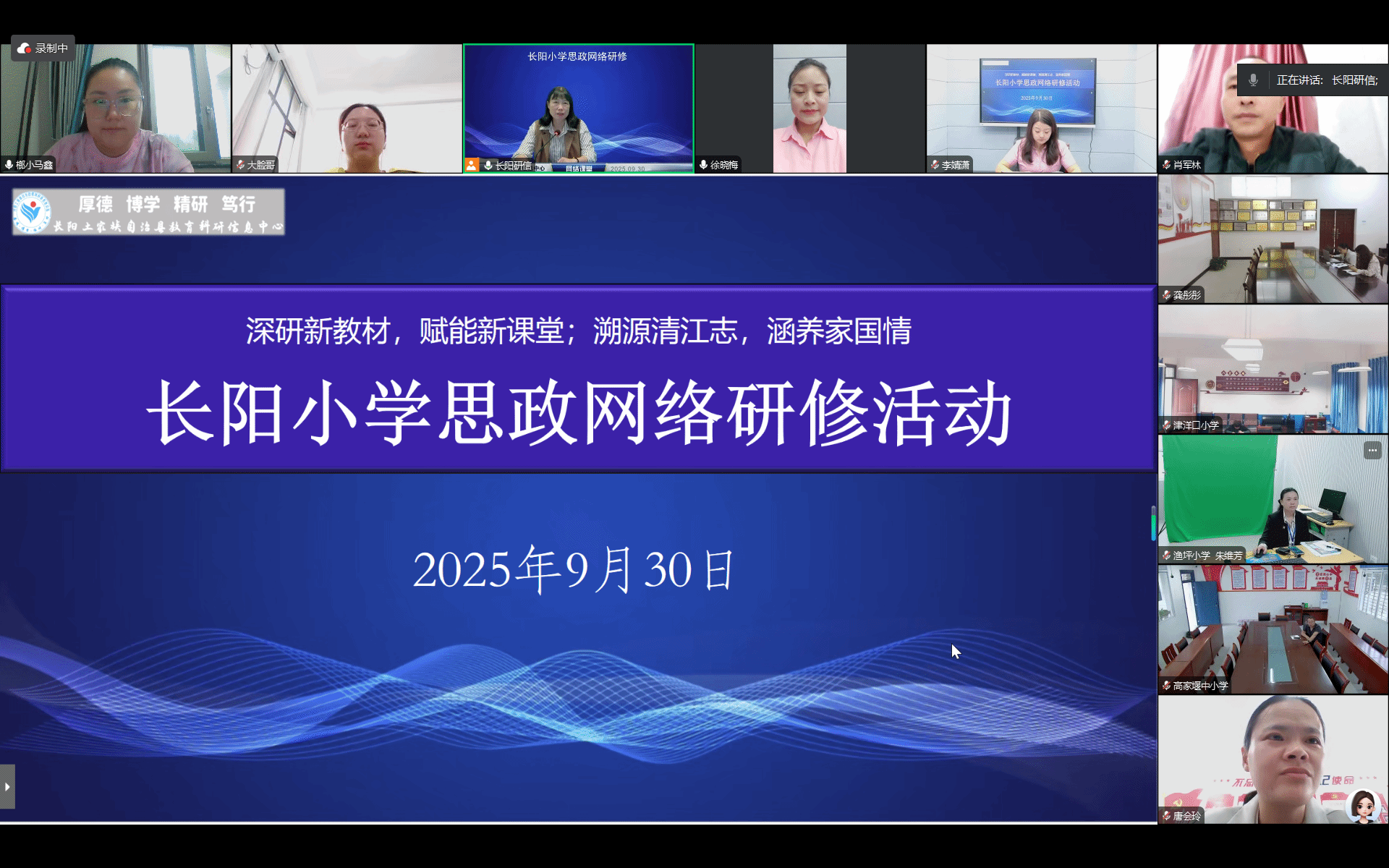 9月30日上午,长阳土家族自治县小学道德与法治新教材培训暨精品课说课网络研修活动顺利举行。本次活动在“源清江·志天下”大思政主题下,以“深研新教材,赋能新课堂;溯源清江志,涵养家国情”为主线展开,全县小学道德与法治学科中心组成员、各单位学科牵头人及学科精品课参赛教师团队共同参与。
