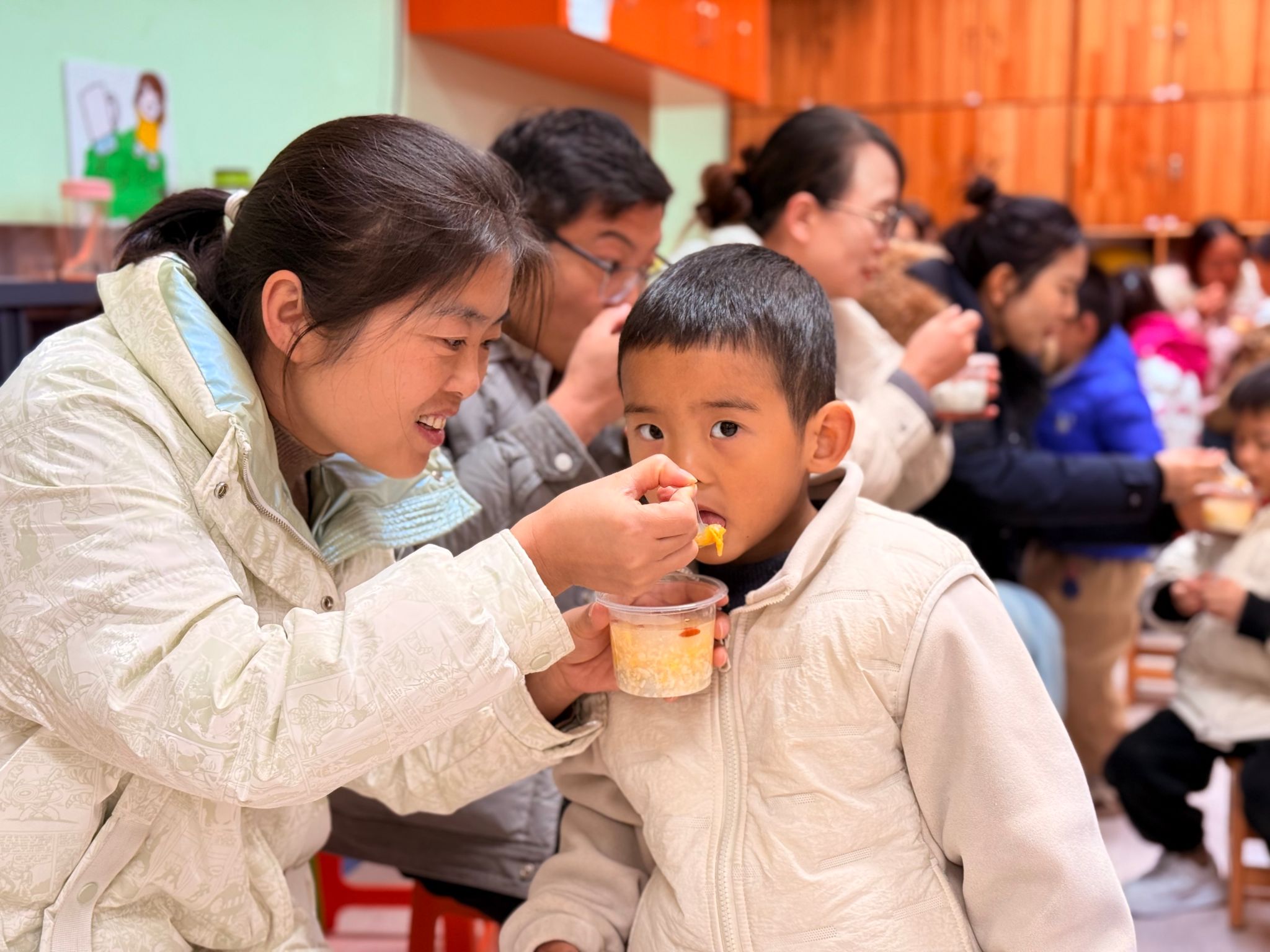 孩子们为自己参与制作的黄酒设计创意标签,把亲手封装的小酒坛作为一份心意礼物,送给园长和老师,表达感谢与祝福。“这是我画的小酒坛,送给园长妈妈!”孩子们脸上洋溢着自豪的笑容。活动还邀请家长走进教室,共同品尝用自制酒酿煮的汤圆。传统美食连接起家园情感,让文化在温馨互动中自然流淌。一位家长感动地说:“孩子回家后还念念不忘房县的黄酒,这样的文化体验比任何说教都更生动、更深刻。”