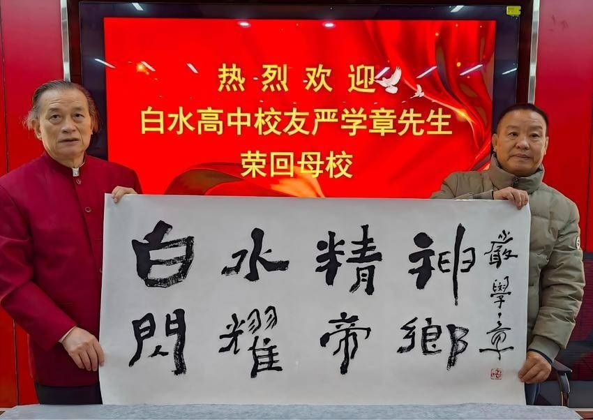 严学章出生于枣阳汉文化核心区域——吴店镇白水村,他深耕书画领域数十年,创立了独树一帜的蟹派艺术,以“横行不霸道”为核心理念,形成了兼具思想深度与艺术张力的创作体系。其代表作《中华全家福》等生肖艺术作品曾作为国礼赠予外国元首,在海内外文化界享有极高声誉。此次返乡,他情系母校学子,亲笔题写“白水精神,闪耀帝乡”“初心如炬,使命如磐”两幅墨宝,笔墨苍劲、意蕴深厚,既饱含对后辈学子的殷切期许,也以艺术创作践行本土文化传承,尽显乡贤反哺桑梓的赤诚情怀。
