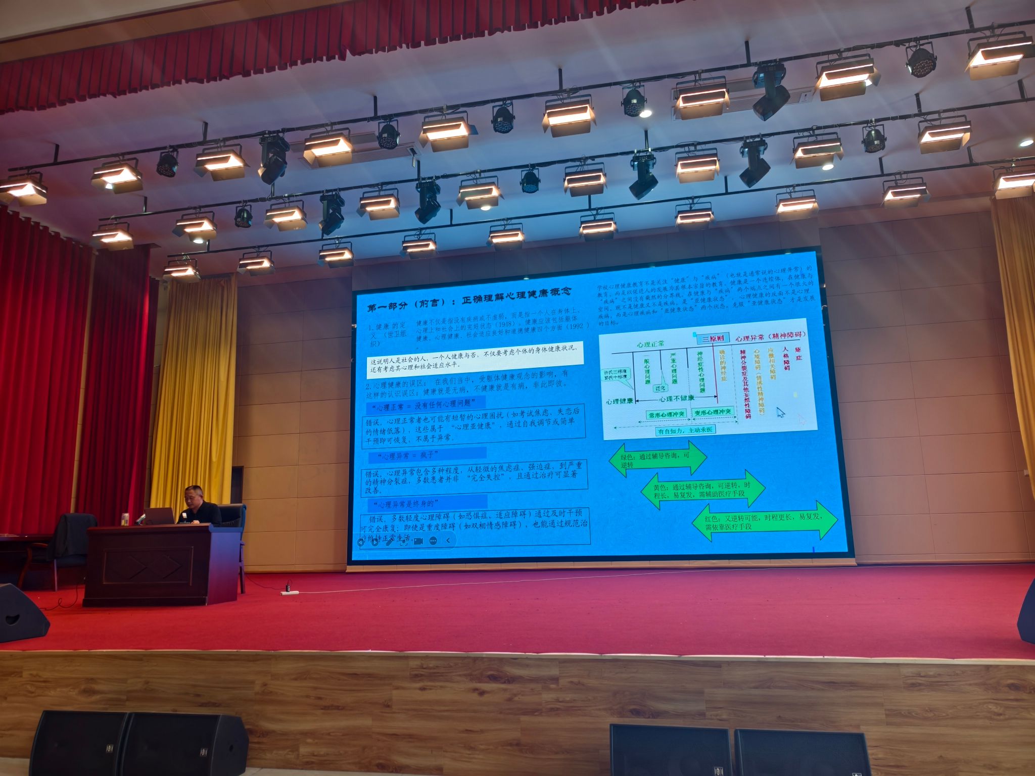培训开篇,围绕心理健康科学概念进行深度解读,澄清“心理正常=无问题”“心理异常=疯子”等常见误区,详细阐释世界卫生组织健康定义、郭念峰“三原则”、许又新“三标准”及郭念锋十项心理健康指标,帮助教师树立科学心育理念,准确区分心理健康、亚健康与心理异常状态,夯实理论基础。