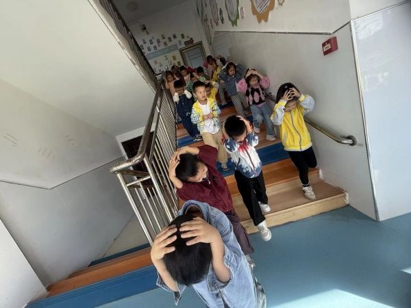 随着演练警报声响起,各班教师迅速到位,引导幼儿保持弯腰、低头、双手护头的姿势,沿着指定路线快速且有序地撤离至操场安全区域。整个过程中,幼儿听从指挥、不慌不忙,从信号发出到全体师幼集结完毕仅用3分钟。演练后,老师现场复盘,针对细节进行温馨提醒,帮助幼儿巩固演练知识。