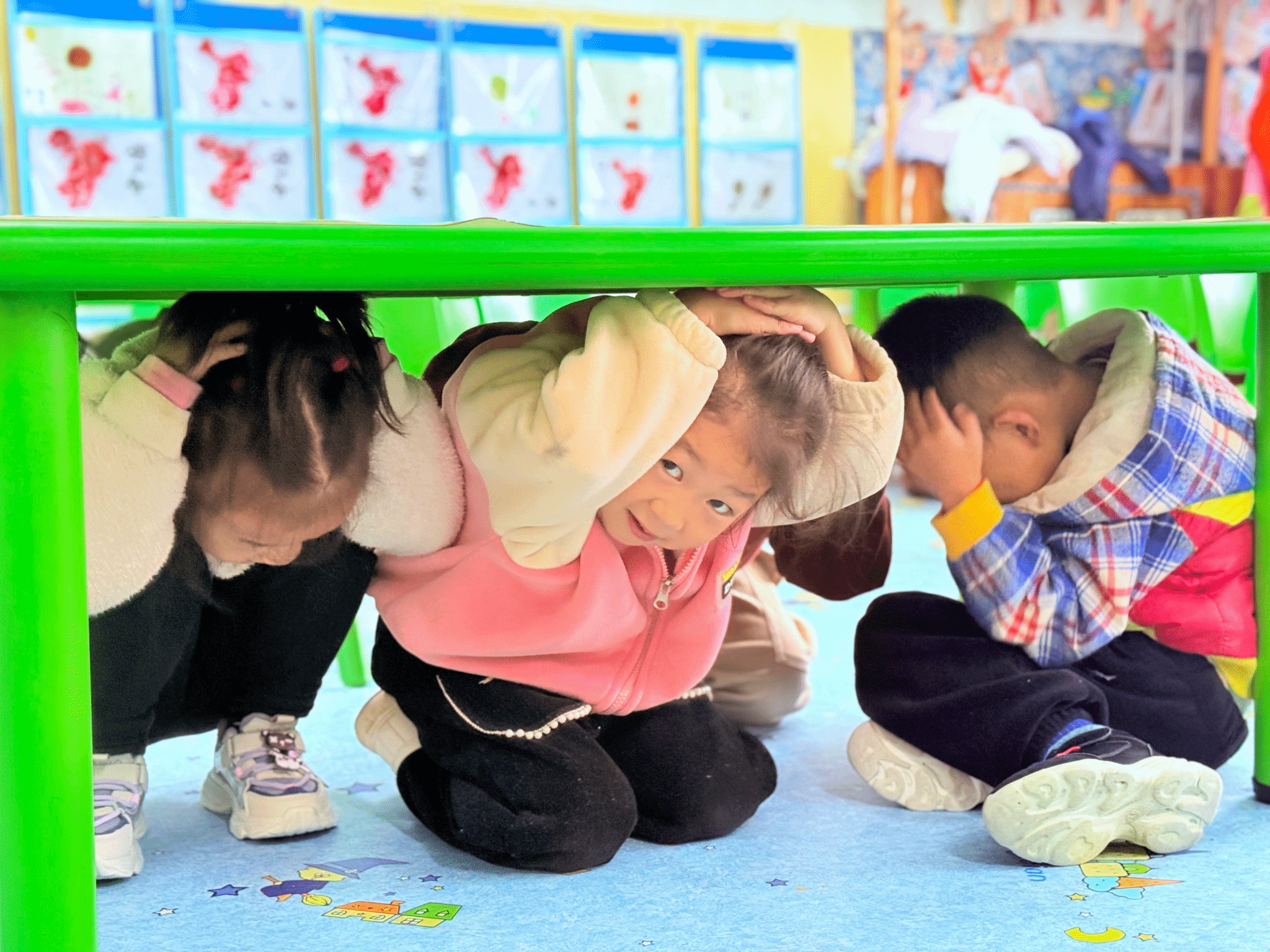 最受孩子们欢迎的是“模拟逃生演练”环节。随着模拟地震警报响起,教师们迅速组织幼儿双手抱头、蹲在课桌下避险;警报解除后,又带领孩子们按照预定路线,弯腰、扶墙、快速有序地撤离到操场安全区域,整个过程紧张有序,孩子们都能听从指令完成动作。演练后,教师借助儿歌、提问等互动,帮助幼儿巩固“不慌张、听指挥、快撤离”的逃生要点。