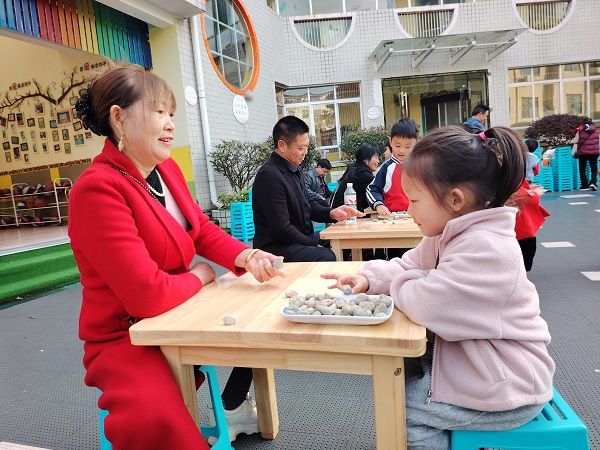 为增进祖孙间的互动与情感交流,幼儿园在户外场地专门设置了投壶、踢毽子、翻花绳、老鹰捉小鸡等传统游戏区域。孩子们牵着爷爷奶奶、外公外婆的手,踊跃参与各项游戏。祖辈们在游戏中重温童年乐趣,孩子们则在亲密陪伴中体验关爱与感恩,传统文化在寓教于乐中得到有效传承。