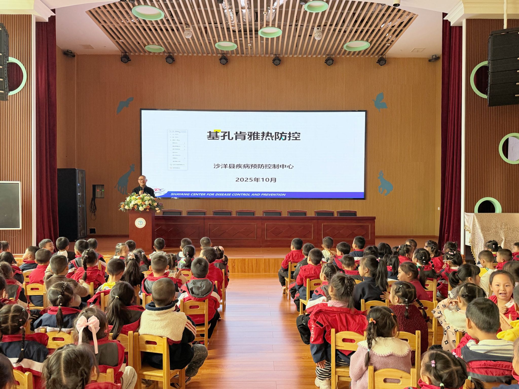 针对近期流行的基孔肯雅热,张校长更是进行了重点讲解。他详细介绍了这种由蚊子传播的疾病特点,通过展示蚊子的图片和模型,让孩子们直观地认识到了传播媒介的模样。接着,他手把手地教孩子们如何做好个人防护,如勤洗澡换衣、保持环境清洁、避免在蚊虫活跃时段外出等。孩子们听得津津有味,纷纷举起小手,积极互动,现场气氛十分活跃。