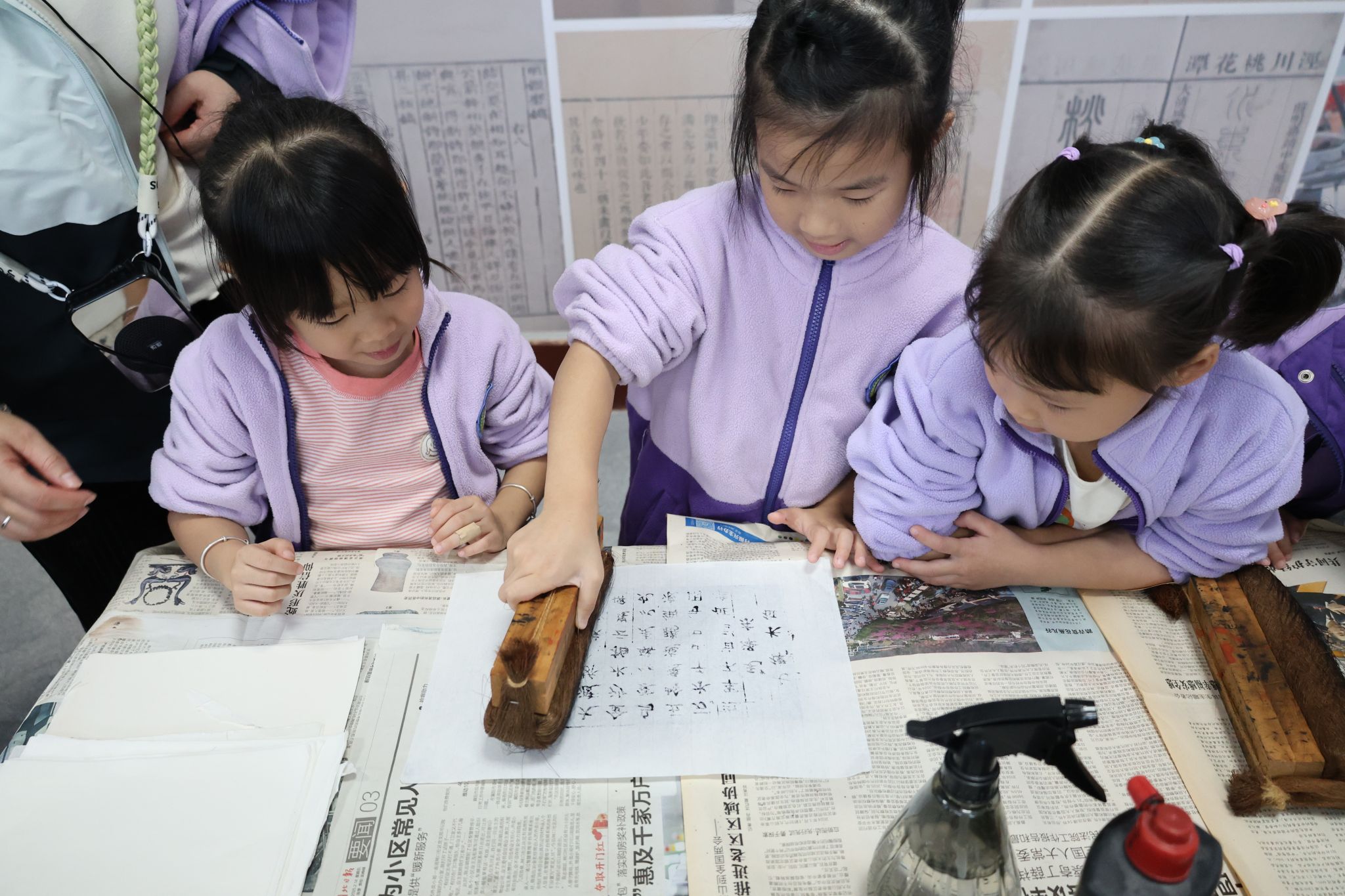 最让孩子们跃跃欲试的,莫过于“活字印刷体验”环节。在工作人员的耐心指导下,孩子们化身“小印刷匠”,亲手操作“拣字——排版——刷墨—拓印”的全过程。一时间,工坊里墨香四溢,孩子们专注地刷墨、铺纸、按压,不一会儿,一个个清晰的汉字跃然纸上。“我印象最深的是‘学’!”“我的是‘好’!”孩子们互相展示着自己的“大作”,现场洋溢着成就感与欢声笑语。
