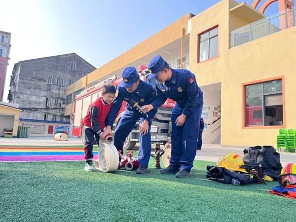 随后的消防技能展示环节,消防员现场演示了单人两盘水带连接的标准操作,动作娴熟流畅。在消防员的指导下,老师和小朋友们纷纷上前尝试,从“看”到“做”,一步步掌握操作要领,在实践中加深了对消防工具的认知。