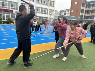 大木派出所胡警官和何警官到场执教,先详细讲解每件装备的功能与使用原理,强调“防护优先、协同作战”的核心原则。随后,民警现场演示处置流程:面对模拟“匪徒”的冲撞,民警持盾牌正面防御,配合约束叉从侧方控制,用抓捕器锁定其肢体,快速将“匪徒”制服,整套动作规范利落。