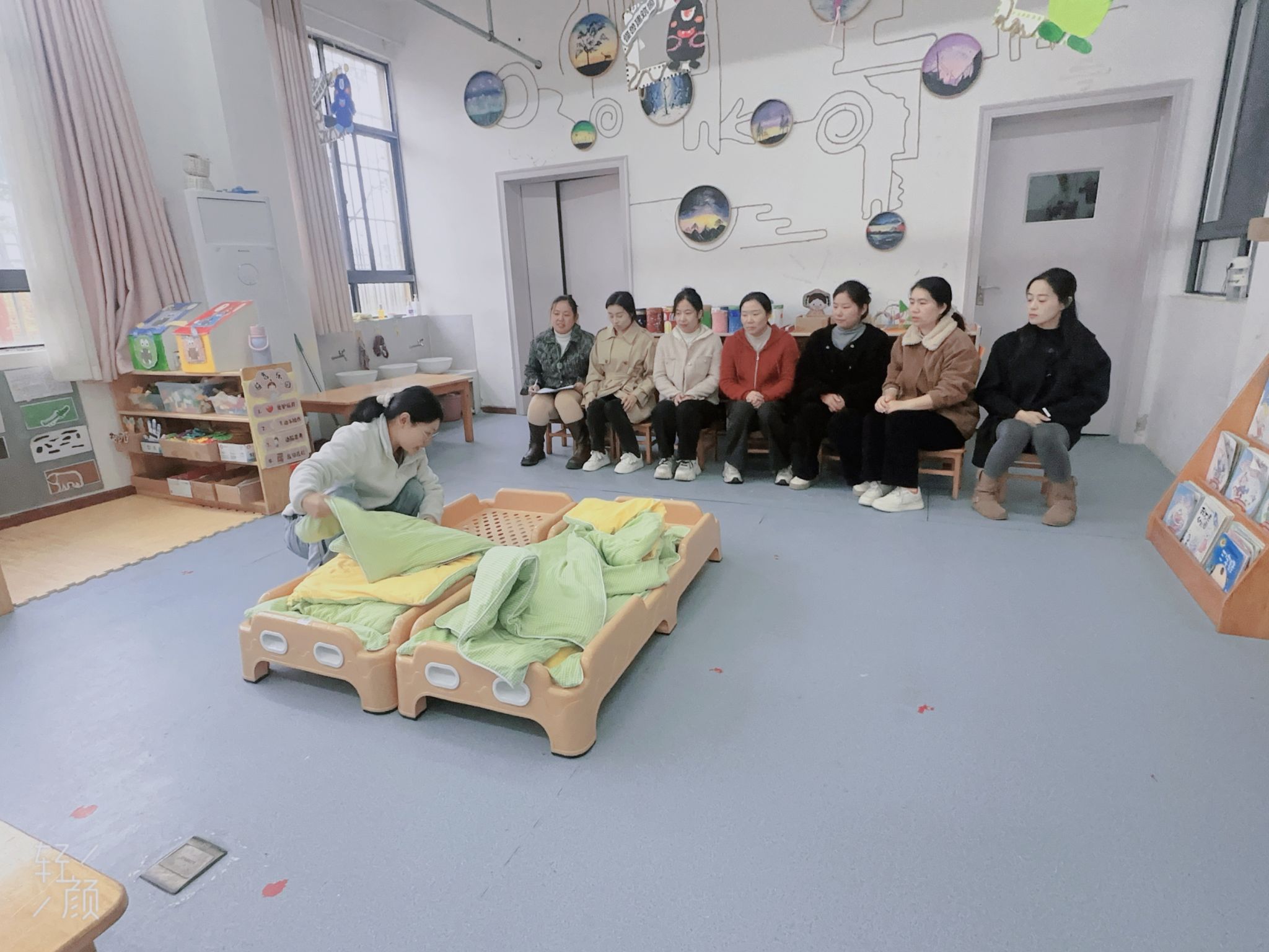 实操环节聚焦保育员日常高频工作,设置“擦桌子标准化流程”与“叠被子速度与仔细度”两大考核项目,由园领导、保健医生及教师代表组成评委团,从操作规范、效率、教育融入等维度评分。