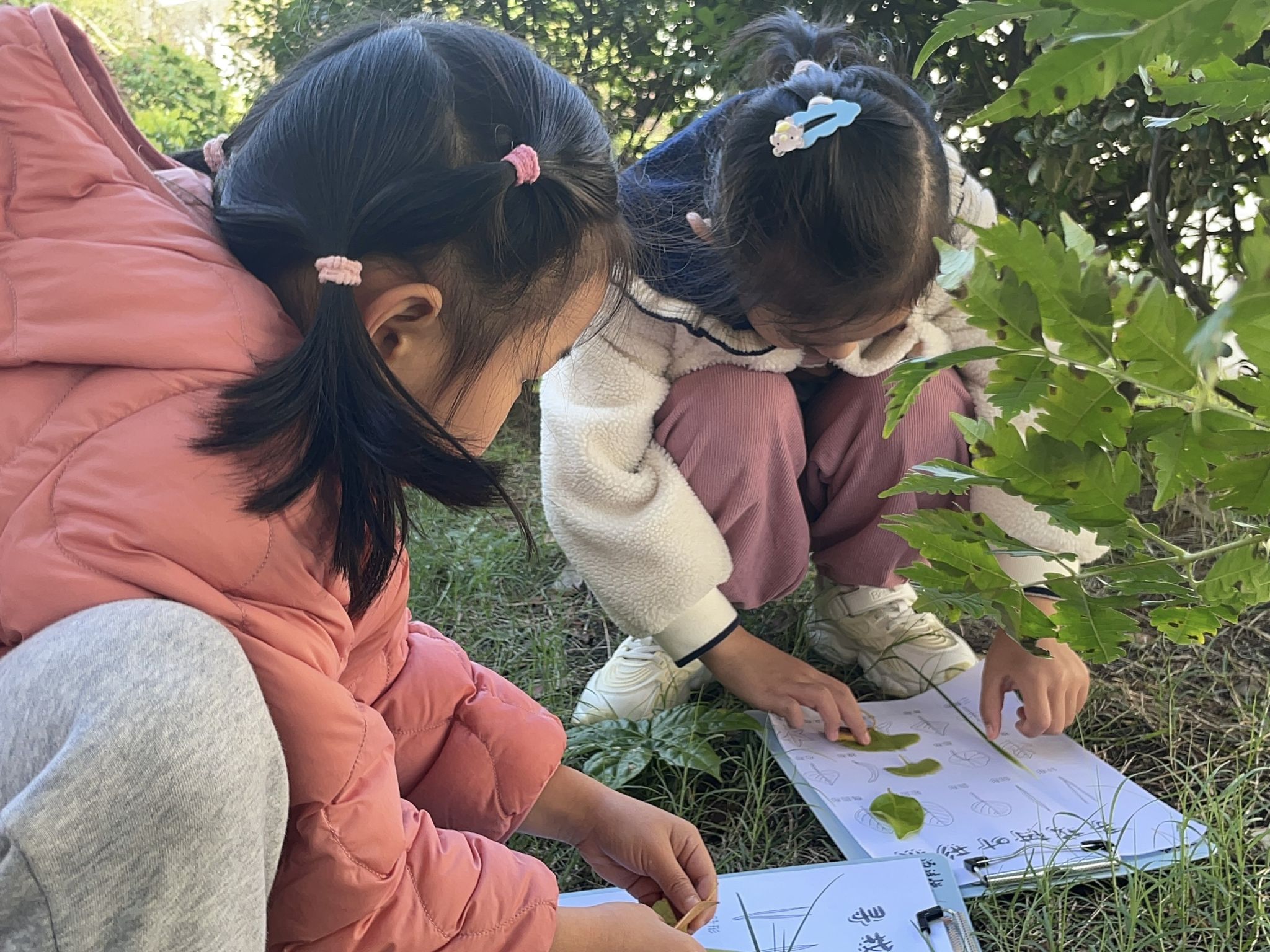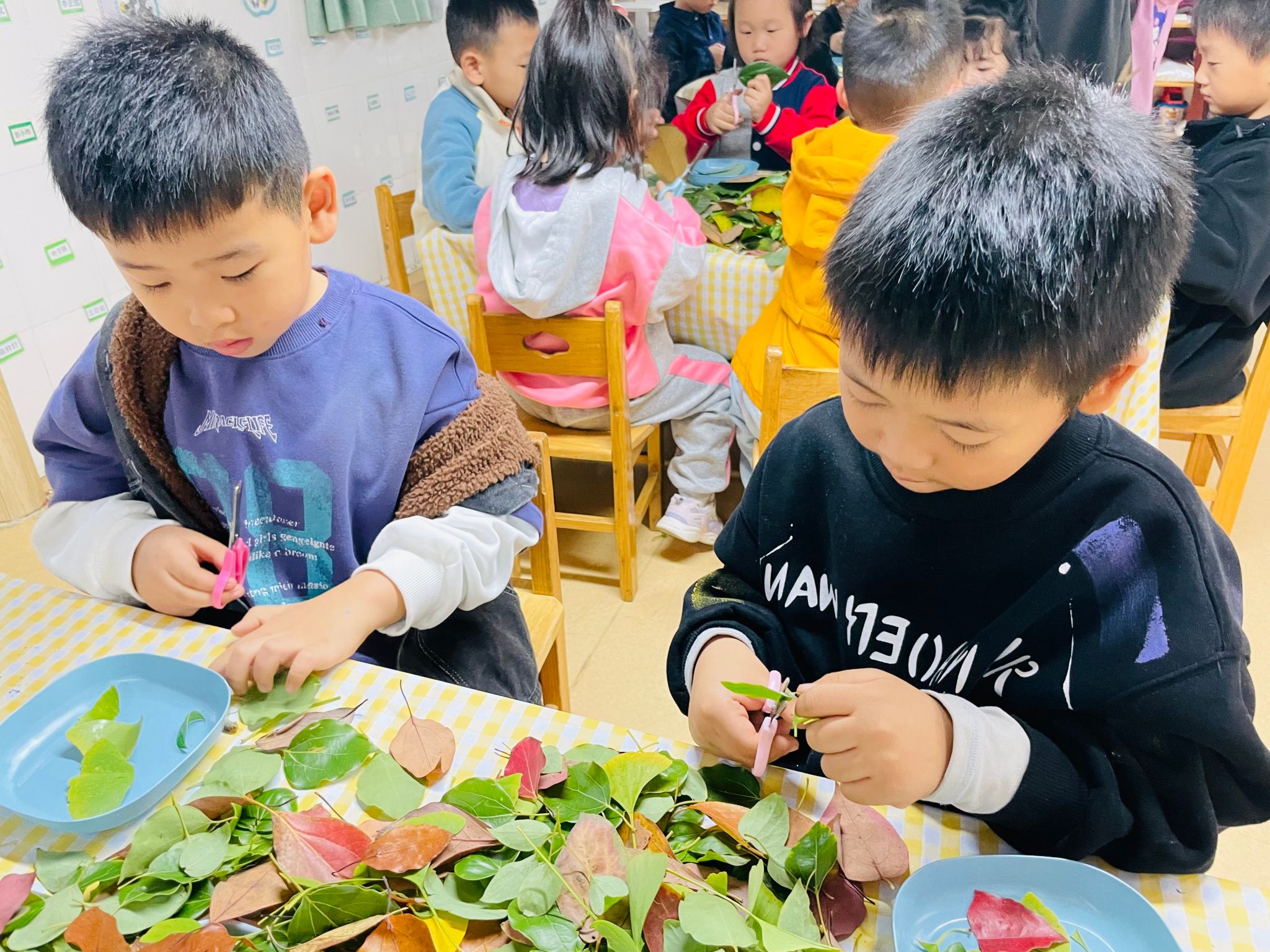 最让孩子们惊叹的是提取叶绿素的小实验。看着酒精慢慢将绿叶中的绿色素提取出来,他们直观地感受到了植物蕴含的科学奥秘。此外,孩子们还尽情发挥创意:给树叶分类、测量,用落叶拼贴出小金鱼、小蝴蝶等生动图案,或是进行树叶拓印、树叶雨游戏。在玩中学,在学中玩,校园里充满了欢声笑语。