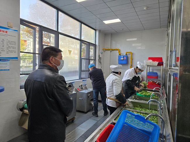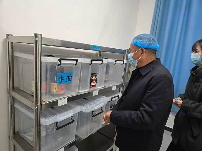 彭毅副局长、高文涛同志一行直奔食堂操作一线,按照 “全覆盖、无死角” 的原则,先后深入食材储存间、加工操作区、餐具清洗消毒区、食品留样柜等关键区域,进行实地细致查看。在食材储存间,领导们仔细核查米、面、油、肉、蛋、奶等原料的采购索证索票、进货查验记录,确保食材来源可溯、质量可控;在加工操作区,重点检查生熟分区存放、“三防” 设施使用及从业人员操作规范情况,强调要严格防范交叉污染;在留样柜前,详细询问留样种类、数量、时间等规范要求,确认食品留样制度落实到位;同时,对食堂环境卫生、从业人员健康证明、食品安全知识培训等情况进行逐一核验。