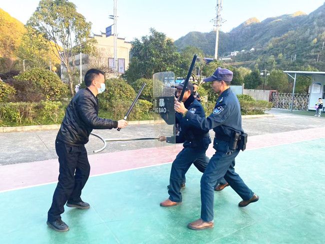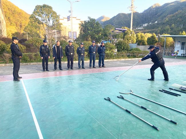 培训环节,派出所民警结合校园安全实际场景,围绕暴力事件预警识别、应急处置流程展开理论讲解,重点强调“先报警、后阻拦、巧周旋”的处置原则。针对防暴盾牌、钢叉等常用器械,民警从握持姿势、防御技巧到协同配合逐一拆解演示,通过“手把手”指导纠正不规范动作,确保每位安保人员熟练掌握“格挡、牵制、合围”的实战技能,同时详解一键报警装置使用规范与联动话术,明确各环节职责分工。