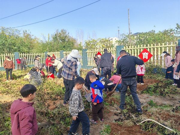 11月27日下午,阳光正好,不热不燥。安陆市木梓乡中心幼儿园的劳动基地里却热火朝天,几十位家长正在领着孩子们挖红薯。