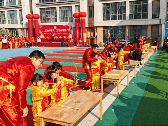 亲子闯关“四大试炼”环节,将体育竞技、匠人精神与抗战精神巧妙融合,成为本次大会的亮点。“弯弓破阵”中,亲子协作搭箭射靶,锤炼凝心聚力的体育精神;“携伤突围”里,亲子携手穿越障碍,感悟坚韧不拔的抗战风骨;“龙舞阵”上,亲子同心舞动巨龙,以协作之力传递传统文化的磅礴生命力;“春福纳祥”环节,全体亲子以武会友,在趣味协作中纳春福、集祥运,让匠人精神在亲子互动中润物无声。
