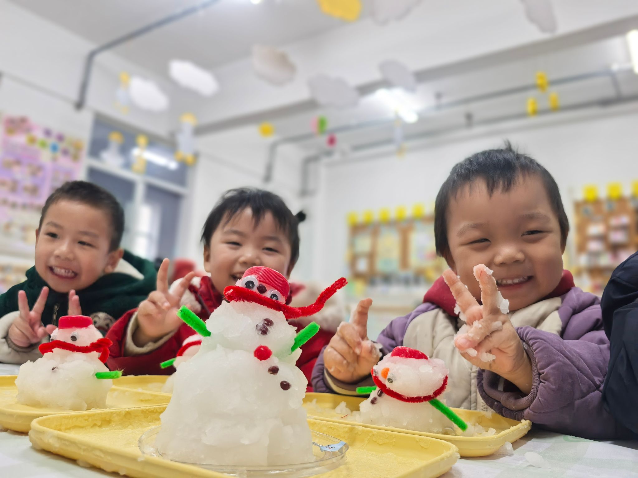 活动伊始,老师绘声绘色讲述《雪孩子》的故事,晶莹雪花与勇敢的雪孩子,瞬间点燃孩子们对冰雪世界的向往。随后,系列趣味活动轮番登场:“探冰雪奇缘”环节,孩子们亲手制作人造雪花,看着材料变身蓬松“雪花”,惊喜之情溢于言表;“创百变雪人”时,彩纸、纽扣、黏土在小手中灵动变身,一个个憨态可掬的雪人作品新鲜出炉;“串美丽雪花”活动里,孩子们专注串联彩珠雪花,制作的挂饰为教室添满冬日氛围。