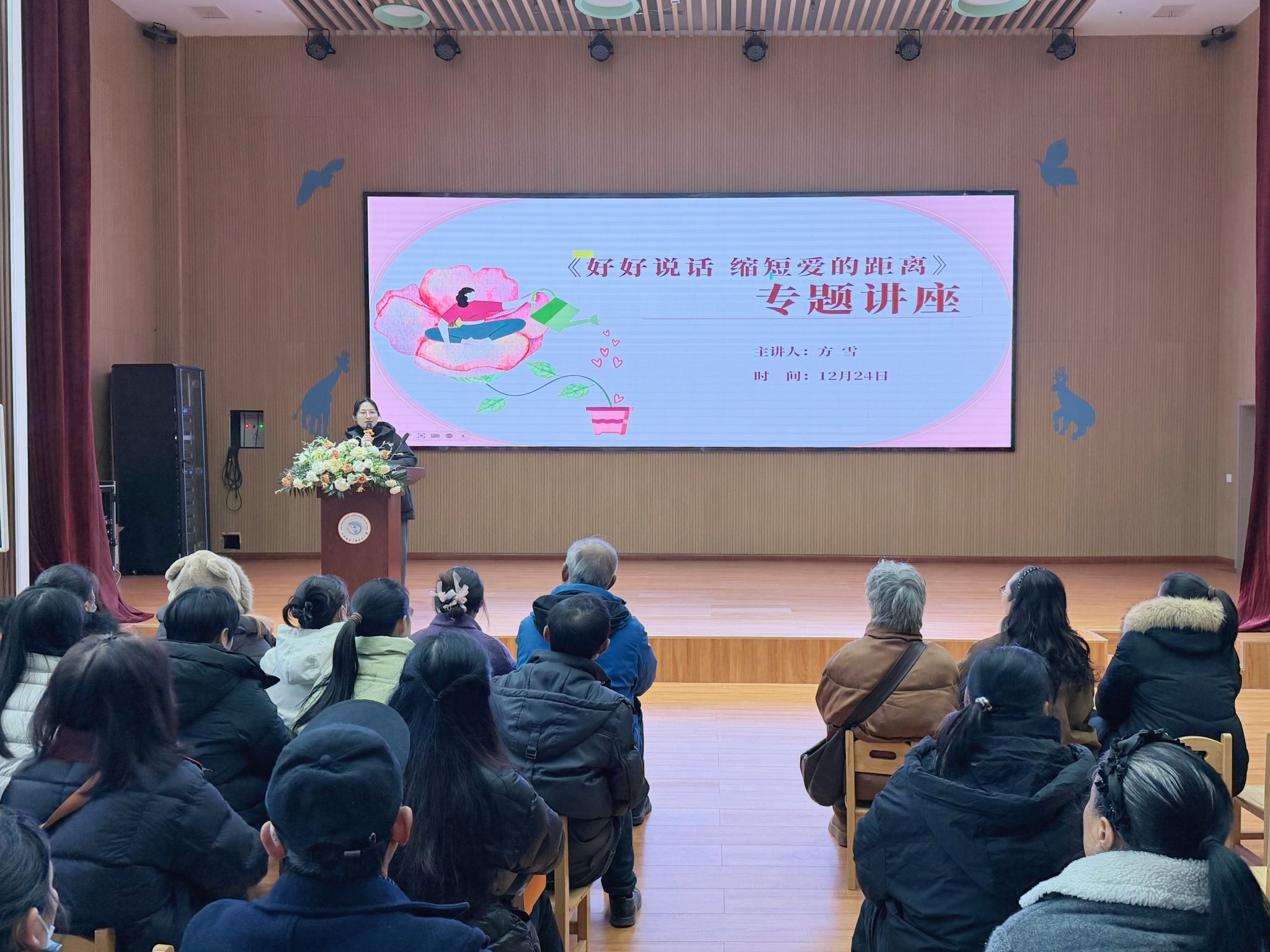 为深入贯彻《沙洋县家校社协同育人“教联体”工作实施方案》,积极响应县教育局关于常态化开展家庭教育指导活动的号召,2025年12月24日下午,沙洋县滨江新区幼儿园“家长学校”正式开讲,特邀专家方雪老师来园,为全体家长带来了一场主题为《好好说话,缩短爱的距离》的精彩讲座,旨在引导家长转变教育观念,掌握科学沟通技巧,营造和谐亲子关系。