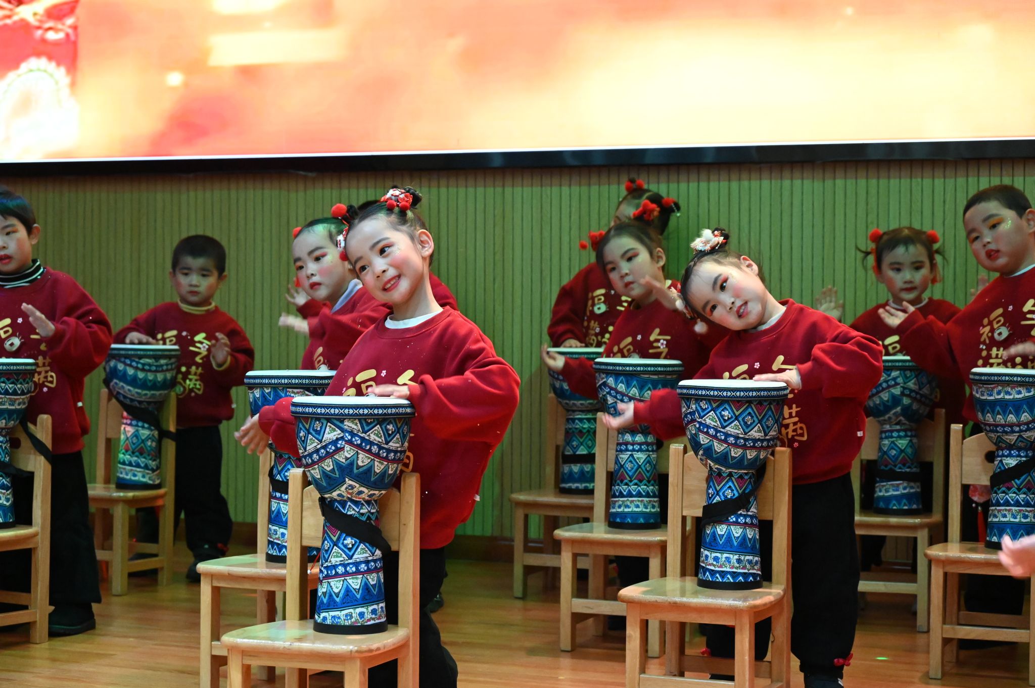 整场汇演节目丰富、形式多样,生动诠释了幼儿园“润和文化”的育人内涵。中班小鼓手带来的非洲鼓表演《开门红》,以明快的节奏和纯真的笑容,敲响了红火新年的第一声祝福,展现了孩子们在“悦·生趣”课程中培养的节奏感与协作力。小班宝贝们接连带来了舞蹈《吉祥娃娃》和《福气到》,稚拙的舞步、甜美的笑容,宛若春风化雨,传递着温暖与好运,正是“润心于微”在幼儿集体生活中的鲜活体现。中班的绘本剧《小年兽》巧妙讲述传统文化,舞蹈《爷爷奶奶和我们》则温情演绎亲情纽带。孩子们在表演中学会感恩与传承,践行着“悦爱心”的社会性培养目标。大班幼儿演绎的情境剧《长征路上》,化身小战士“重走”长征路,展现了勇气与担当。舞蹈串烧《最好的舞台》则释放出无限的活力与自信,体现了“和行远”的成长导向。实习老师们带来的舞蹈《向快乐出发》,展现了青年教师“润己以诚,和善立教”的专业风采,师幼共舞的和谐画面,正是“和生于共”理念的动人写照。