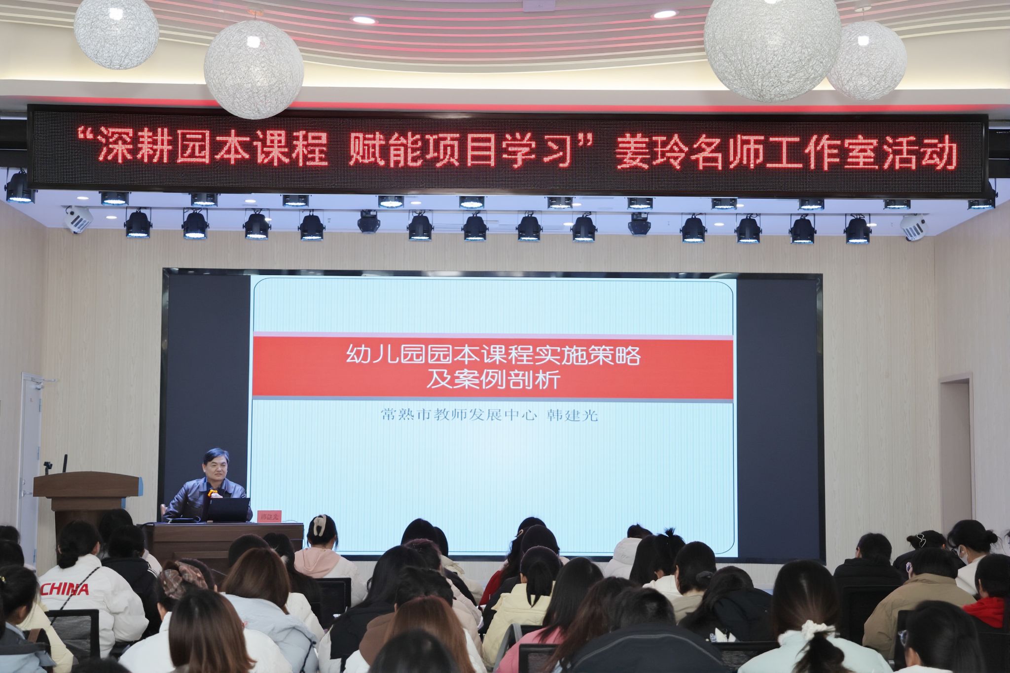 为深化园本课程建设,推进项目式学习落地实施,破解园本课程实践中的难点堵点,2026年1月10日,以“深耕园本课程 赋能项目学习”为主题的姜玲名师工作室活动在津洋口幼儿园顺利举行。此次活动特邀江苏省常熟市教师发展中心韩建光主任作专题辅导,姜玲名师工作室全体成员、津洋口幼儿园全体教师,以及全县各幼儿园园长、教师代表共计150余人参与本次活动。