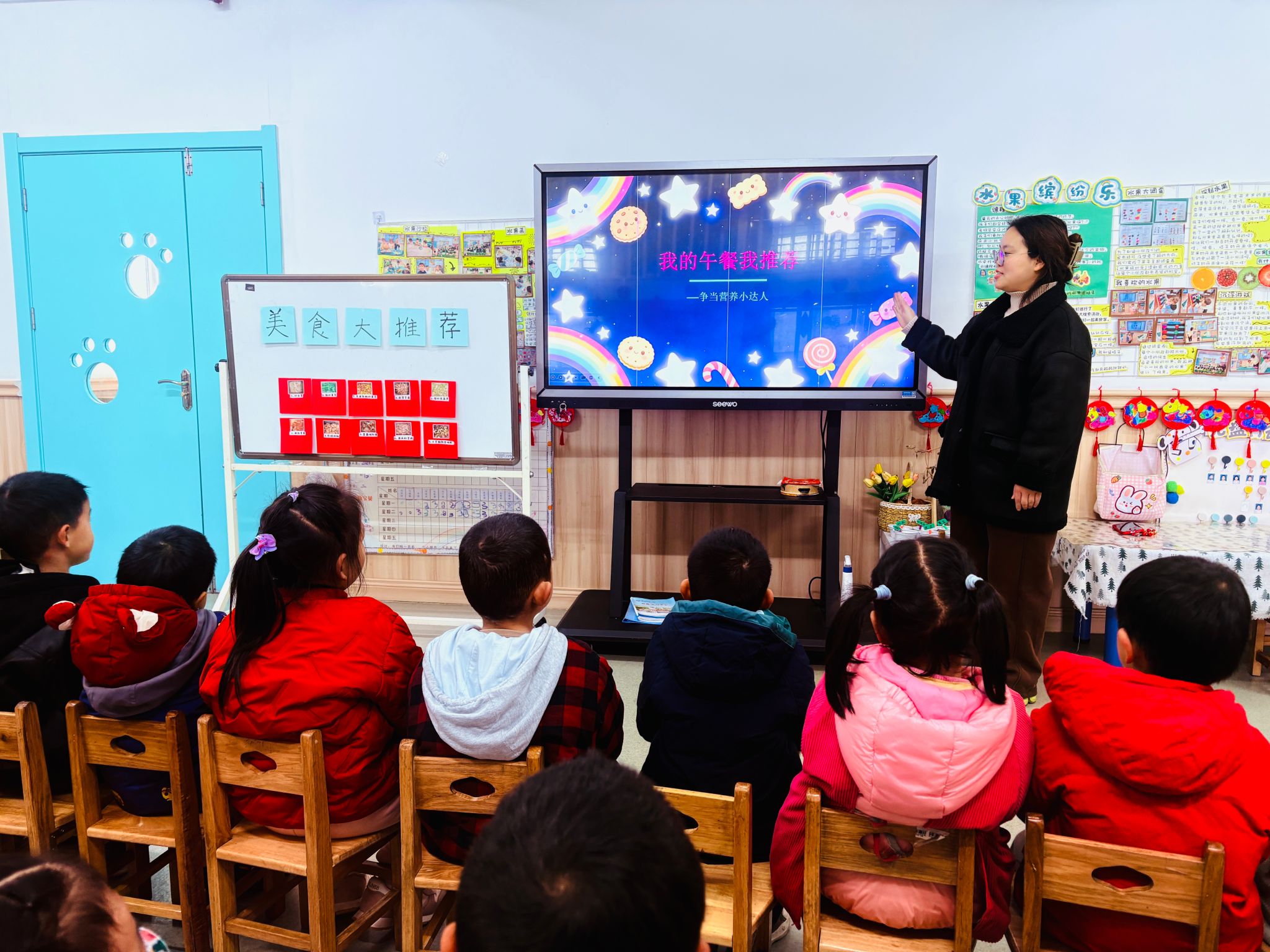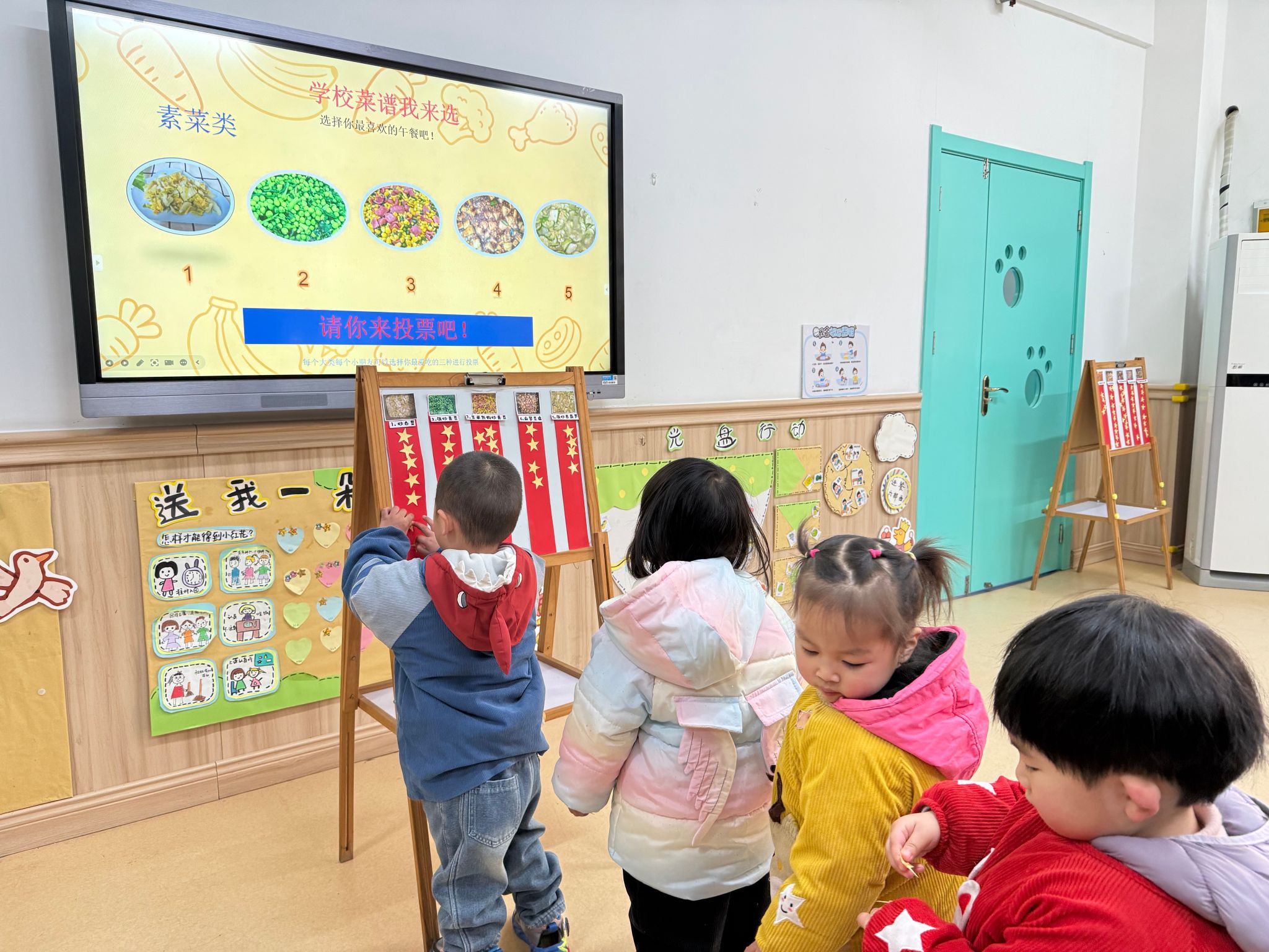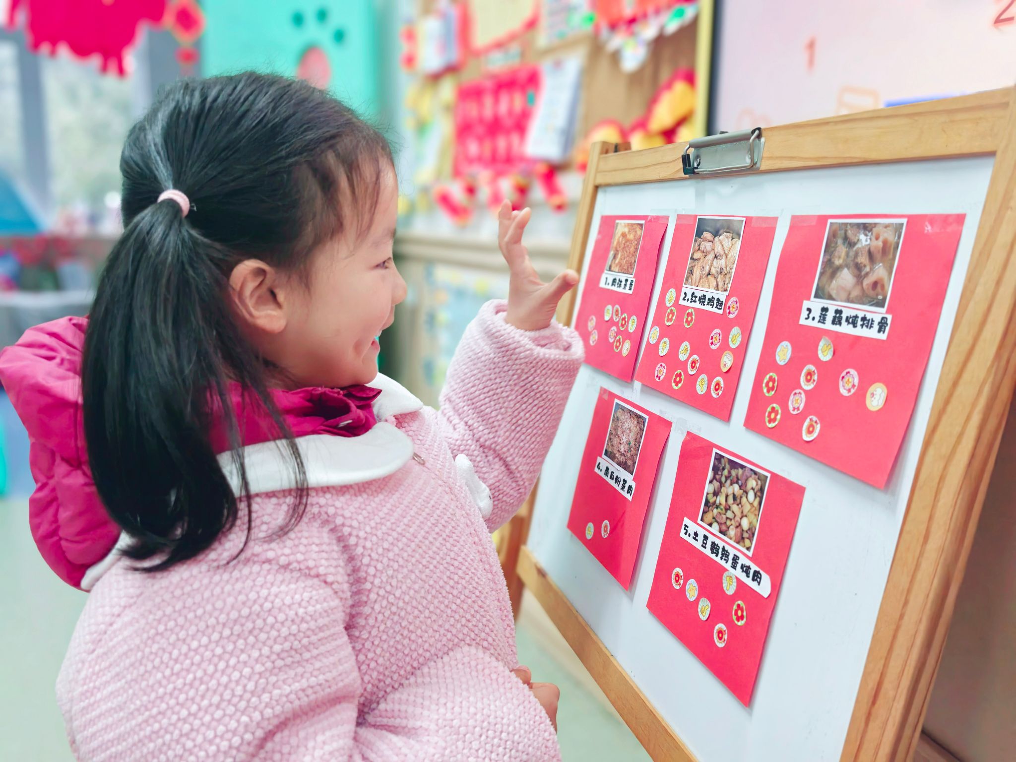 活动当天,一幅幅诱人的美食图片展现在孩子们面前。让孩子们自己选择,不仅能让饭菜更对他们的胃口,更是一次生动的自我表达与决策练习。在老师的引导下,小朋友们兴奋地寻找自己最喜欢的菜品,郑重地将代表“喜欢”的贴纸贴上去。“我给鸡翅投票!”“肉末蒸蛋最好吃!”稚嫩的童声里满是认真与欢喜。孩子们的选择清晰而直接,色彩鲜艳的“玉米青豆炒火腿”、香喷喷的“红烧鸡翅”获得了最高人气。