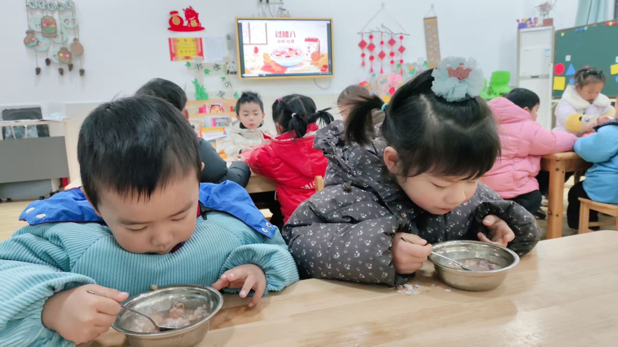 活动从有趣的“识五谷”环节开始,孩子们通过看、摸、闻,兴致勃勃地认识了熬制腊八粥的各种食材。当一锅锅凝聚着孩子们劳动的腊八粥煮好,香气四溢,大家围坐在一起,品尝着自己参与制作的甜粥,小脸上洋溢着满足与快乐。