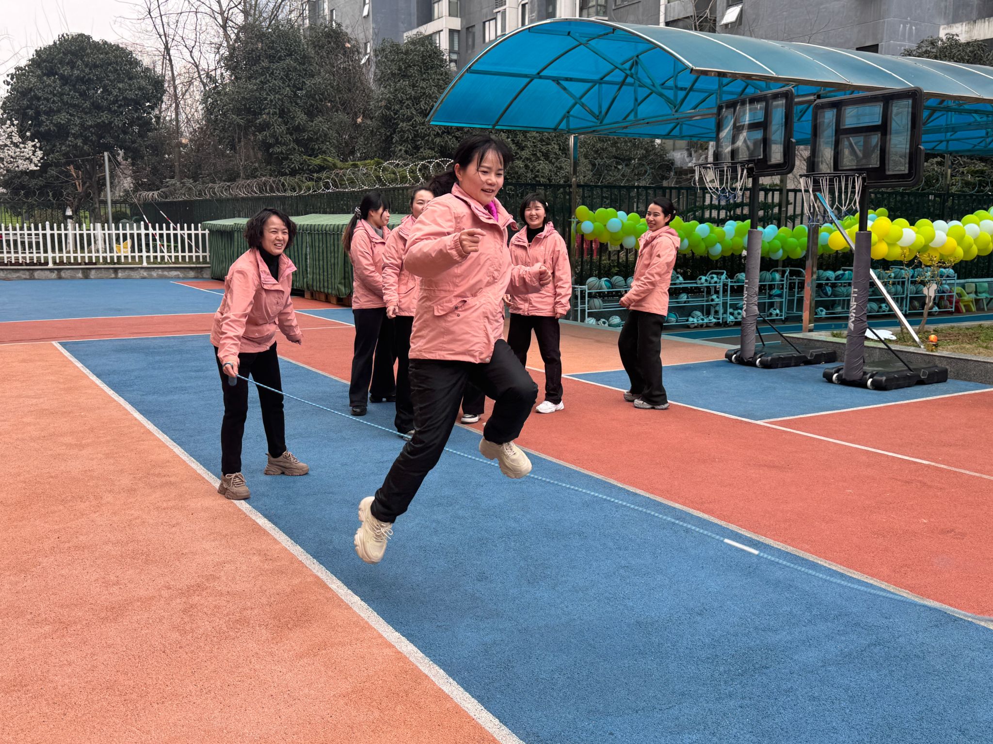 随后进行的集体跳长绳活力四射。伴随着长绳翻飞的节奏,老师们身姿轻盈、默契配合,依次穿梭跳跃,加油声、欢笑声此起彼伏,充分展现了幼教团队朝气蓬勃、团结向上的精神风貌。