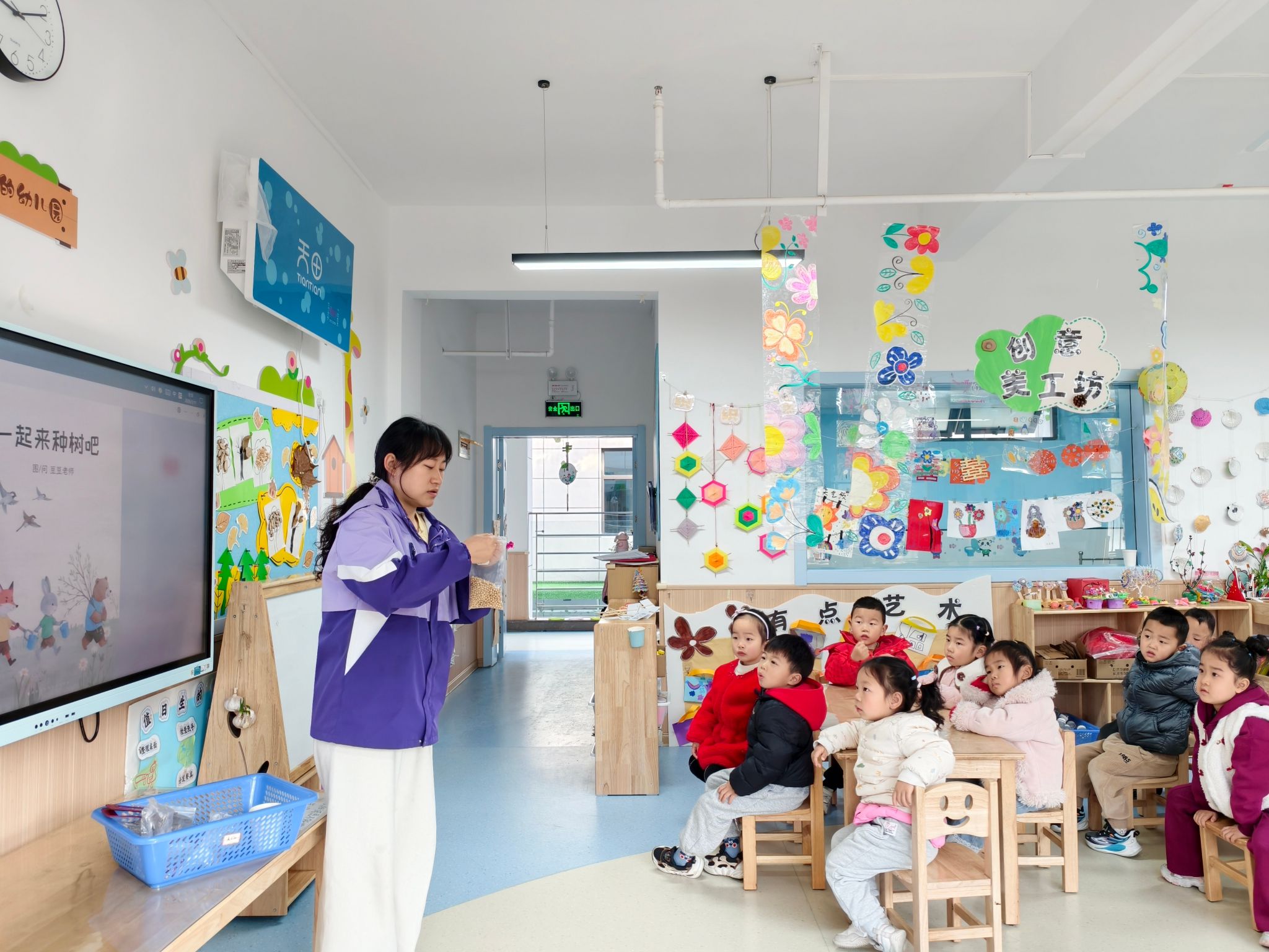 活动伊始,全园各班级开展绘本共读活动,老师带领孩子们共读《一起来种树吧》,通过趣味讲解引导幼儿观察绘本画面,了解植树节的意义,知晓大树能净化空气、为小鸟安家的生态价值,让“种树护绿就是保护家园”的理念走进童心。在生动的绘本故事后,各年级组开启特色实践环节,让孩子们在动手操作中亲近自然、感受劳动乐趣。