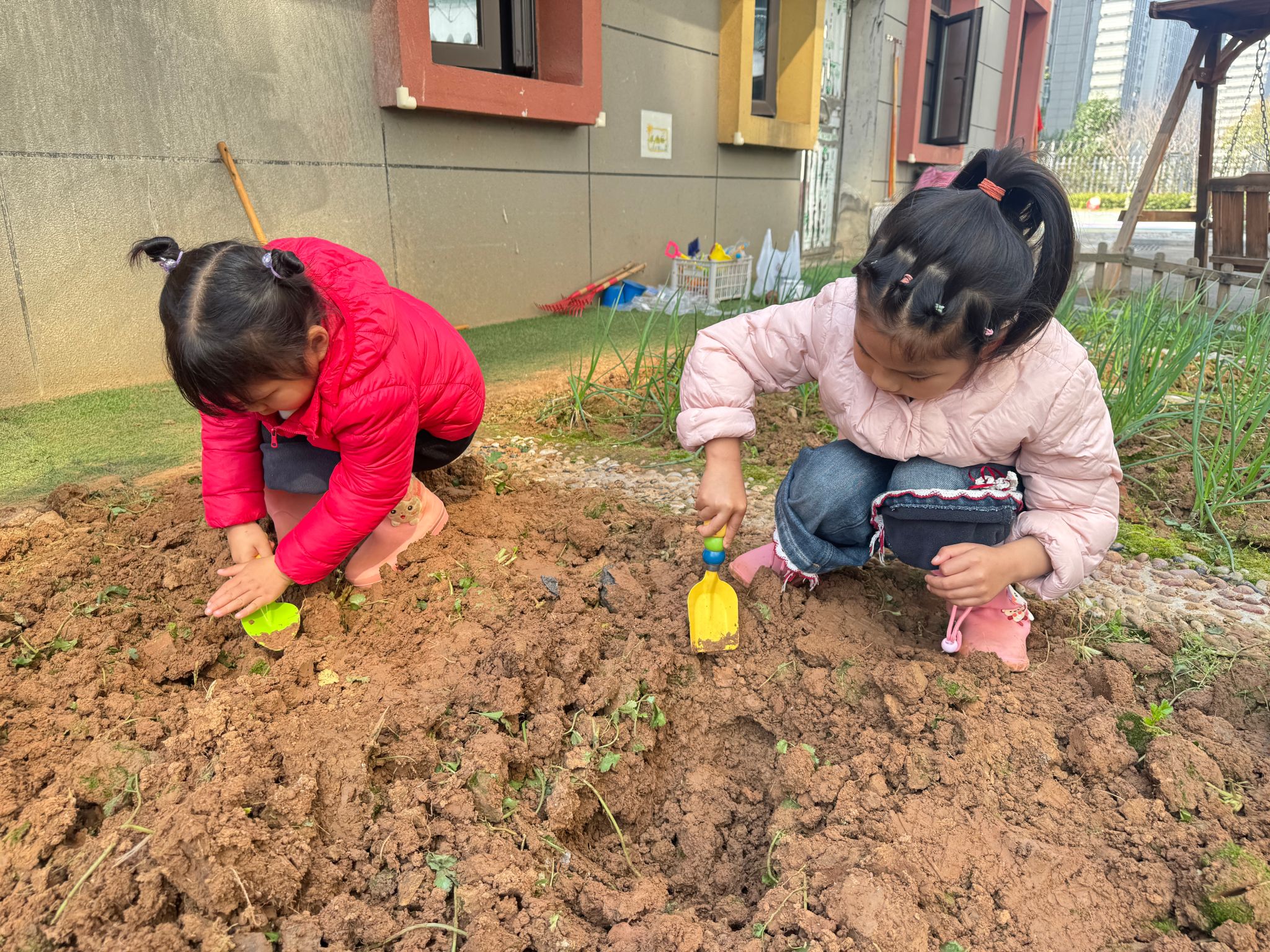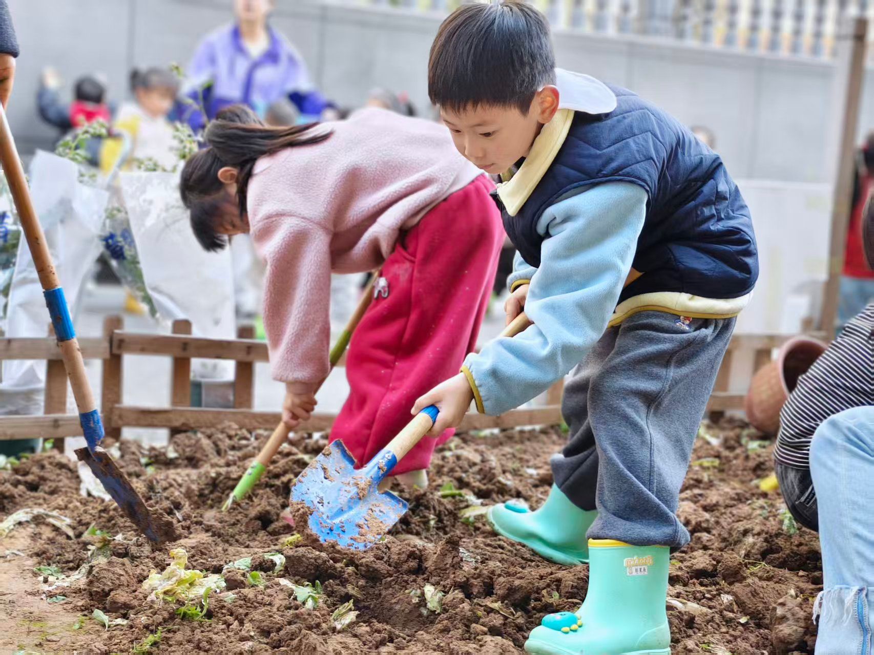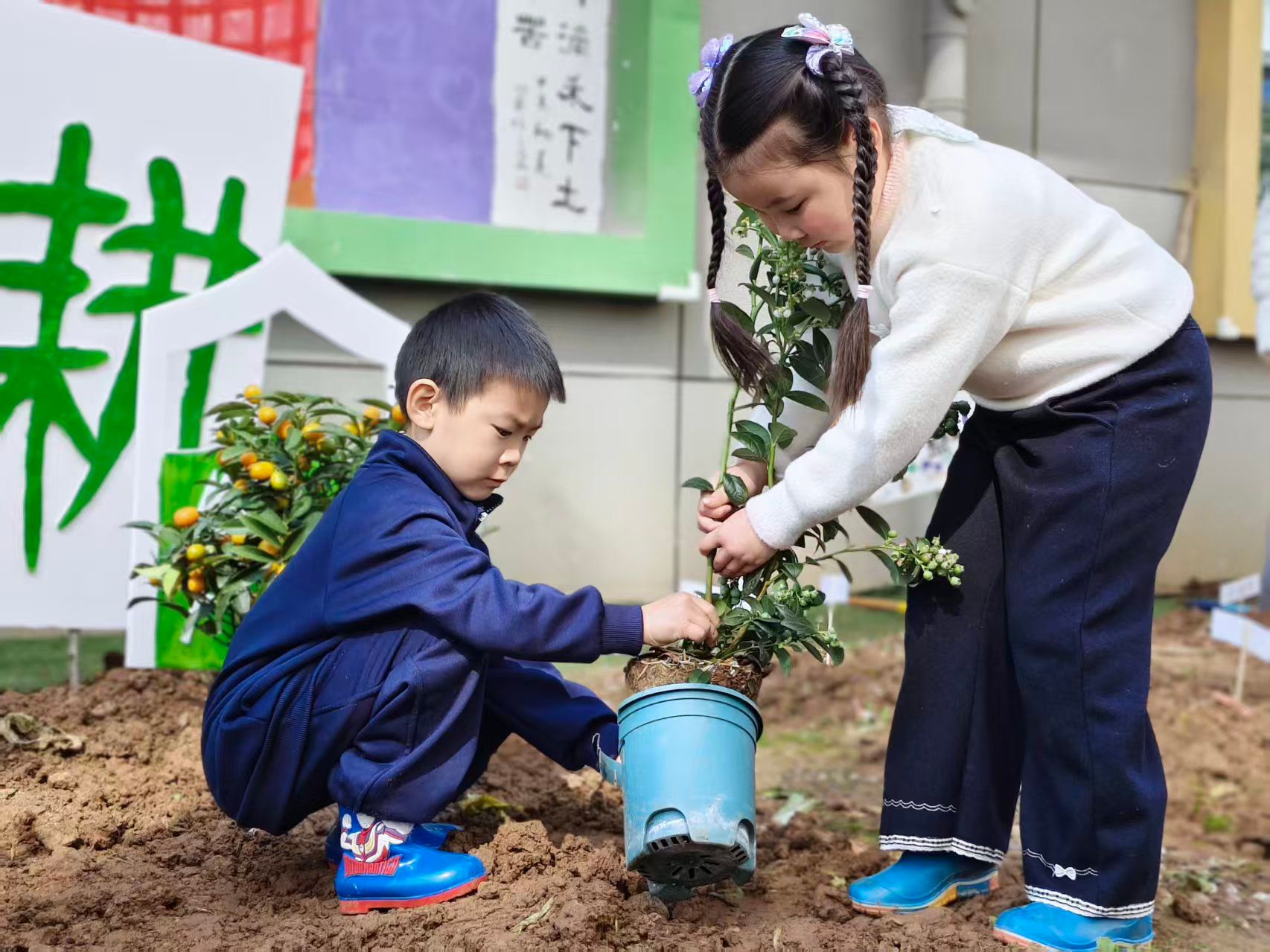 小班萌娃在户外操场化身小小绘画家,以手掌涂鸦创作春日大树,在色彩创作中感受自然之美;中班幼儿于郡幼小院开展田间播种,认识土壤、学习播种步骤,种下向日葵等种子并做好标记与观察约定,在实践中培养责任意识;大班孩子分组协作种下金桔、蓝莓树苗,在挖坑、放苗、浇水等全套操作中体验集体劳动的快乐。