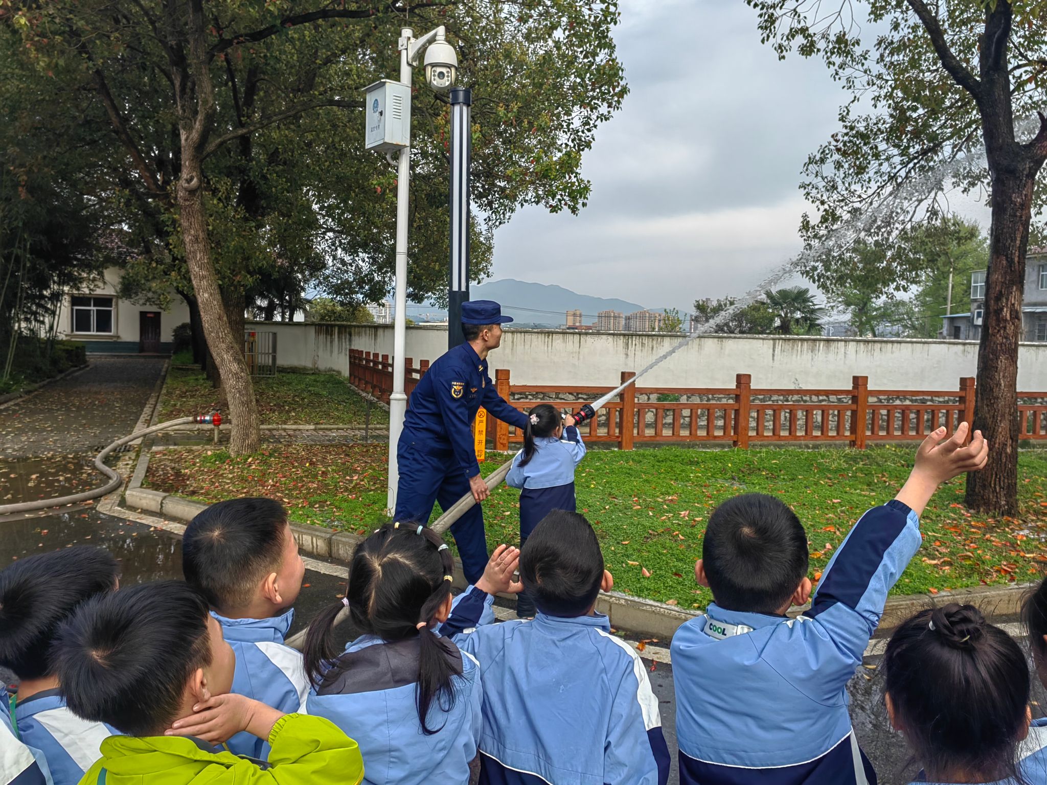 最后,全体师幼与消防员叔叔在消防车前合影留念,用镜头定格下这一难忘而有意义的瞬间,那一抹亮眼的“火焰蓝”与孩子们的童真笑脸相互映衬,成为本次活动最温暖的注脚。