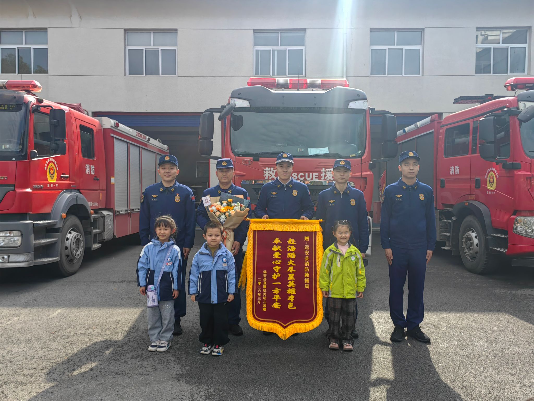 体验结束后,大家在指定区域整齐集合,在孟娟老师的主持下,幼儿代表向消防员叔叔郑重敬献鲜花与锦旗,一张张灿烂的笑脸,传递出孩子们对消防员的崇高敬意与感恩之情。