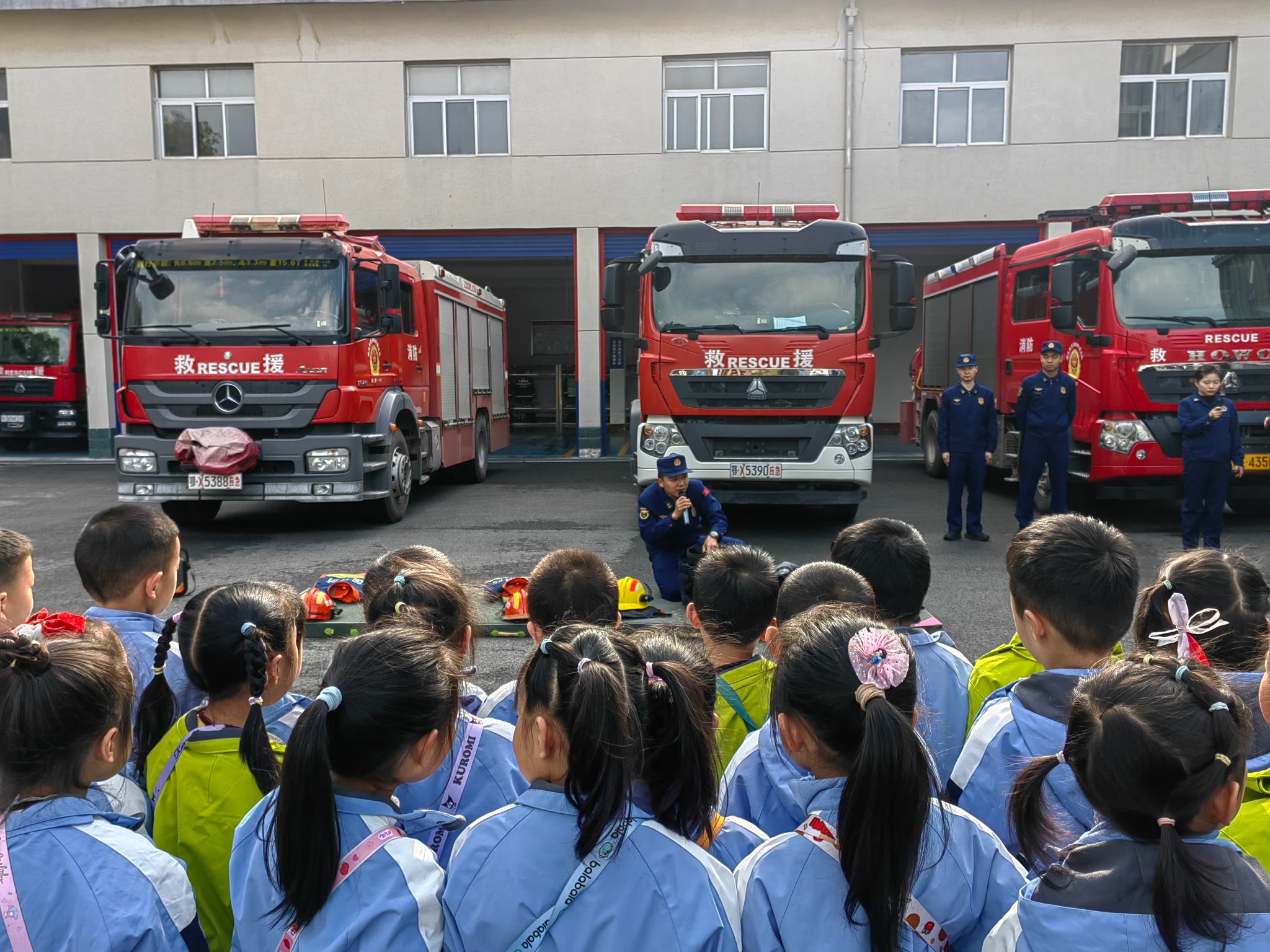上午8:40,孩子们和老师一起乘车抵达目的地,下车后,孩子们迫不及待地开启了奇妙的消防探索之旅。在消防员叔叔的专业引导下,大家分组有序参观各类消防器材装备,从灭火器的使用方法,到破拆工具、空气呼吸器的功能用途,消防员叔叔用通俗易懂的语言逐一讲解,孩子们睁着好奇的眼睛,认真聆听、积极提问,仿佛置身于生动的消防知识课堂。更令人兴奋的是体验环节,在消防员叔叔的安全保护与指导下,孩子们试穿消防服,亲手操作消防水带,感受不同方式出水的力量,近距离触摸消防车,直观了解车辆构造与功能,沉浸式感受消防员叔叔工作的艰辛与不易。