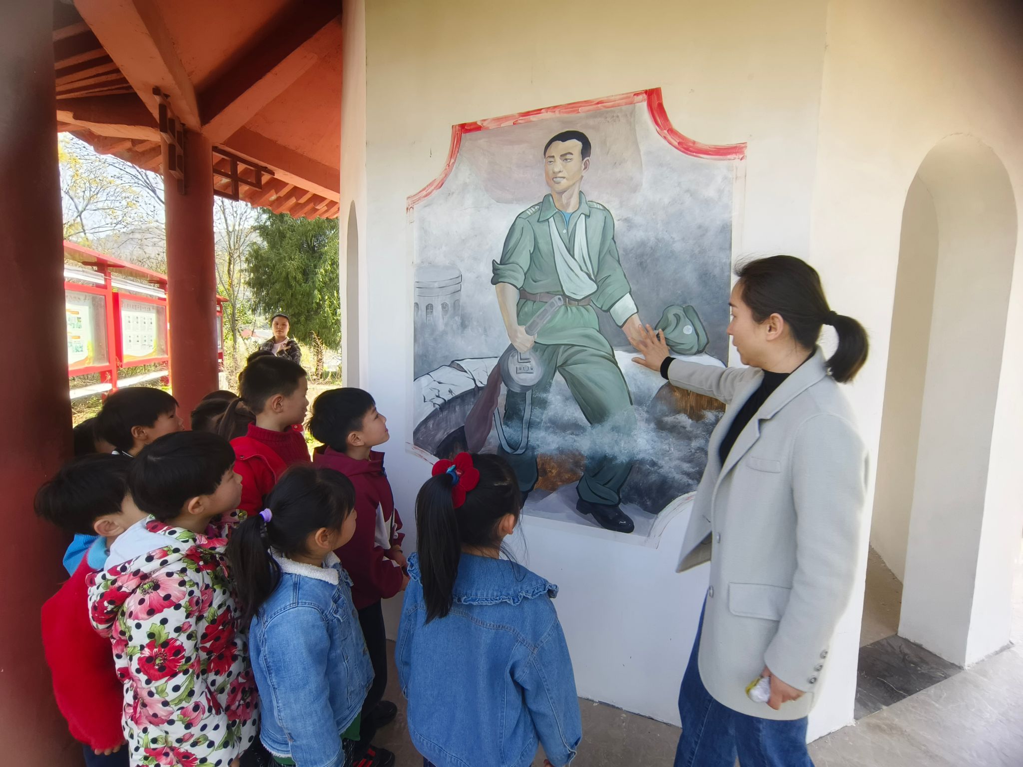 清晨,孩子们在老师带领下排着整齐的队伍,手持自制小白花,神情庄重地来到纪念碑前。全体师生鞠躬默哀,寄托对革命先烈的深切哀思。郭园长现场为孩子们讲述了张子耀、李保帮、王有文等白桑关镇本土英烈的光辉事迹。这些英雄有的在土地革命时期组织农民运动英勇就义,有的在解放战争剿匪中壮烈牺牲,有的将热血洒在抗美援朝和自卫反击战的战场上。随后,孩子们依次献上亲手制作的小白花,并在老师带领下瞻仰纪念碑,学习“十大英模”光荣事迹。