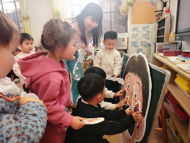 活动现场温情满满、趣味十足。家长们化身故事主播,用童趣语言、夸张表情演绎《小猫钓鱼》《好饿的毛毛虫》《小兔子乖乖》等故事。除了生动讲述,还设计了丰富的互动环节,引导幼儿举手回答、模仿角色动作,并通过动手操作小道具、指认绘本画面等形式参与其中。孩子们专注聆听、积极互动,在动手动脑中感受阅读乐趣,现场洋溢着欢快浓郁的书香氛围。