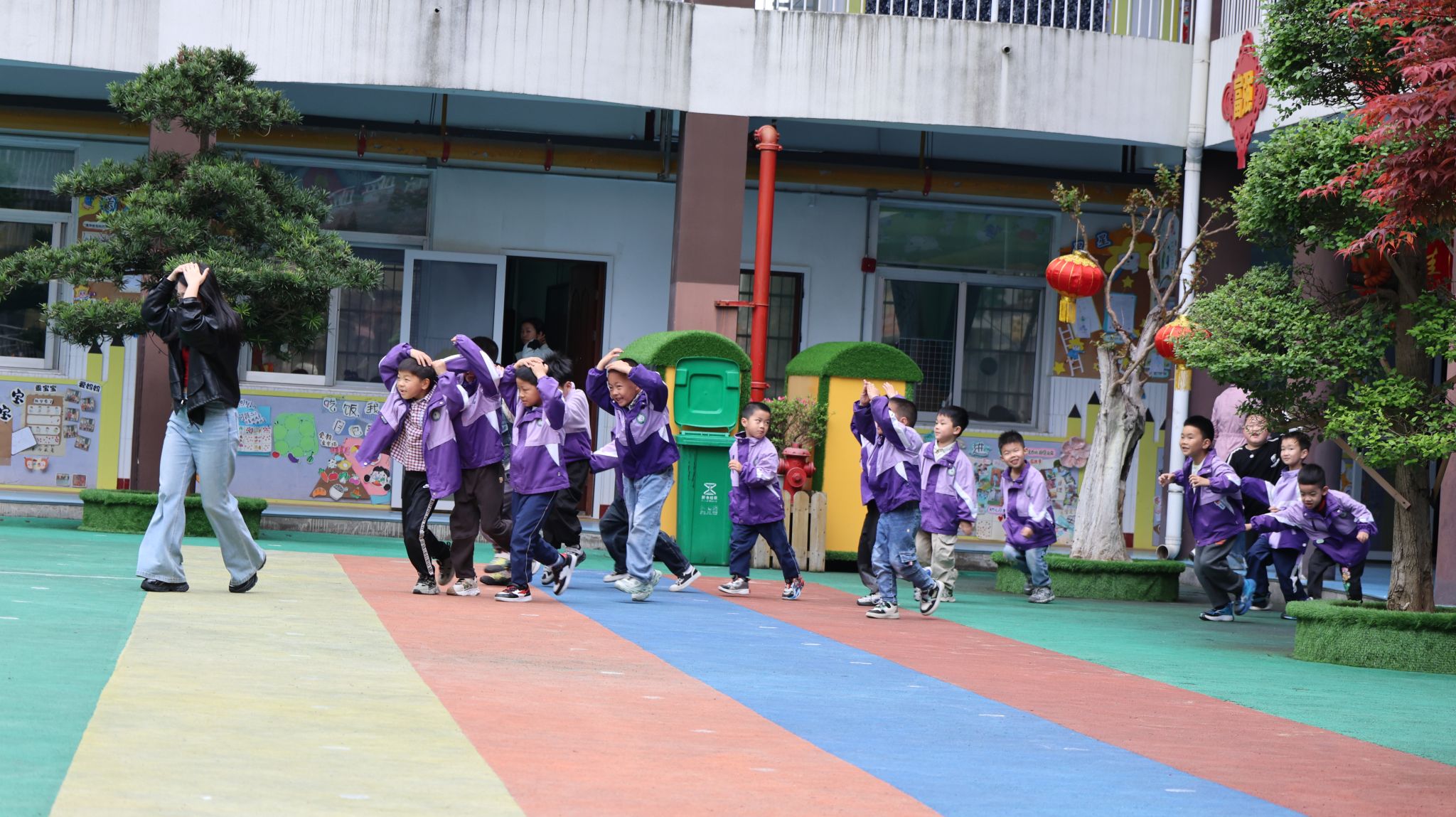 上午8:40,警报声准时响起。各班教师立即停止活动,孩子们迅速拿起湿毛巾捂住口鼻,弯腰低姿,按照“一楼为先、二楼三楼四楼为后,靠近楼梯班级为先、远离楼梯班级为后”的固定原则,沿预定路线有序撤离。整个过程没有慌乱尖叫,没有争抢推搡,全体师幼在极短时间内安全抵达指定集合区域。各班教师第一时间清点人数并上报,确保不漏一人。