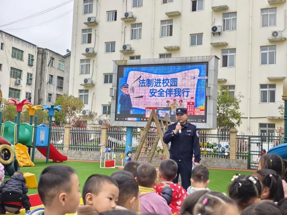 活动现场,民警结合幼儿的认知特点,以生动活泼、通俗易懂的语言,围绕校园安全、防拐骗、交通安全、防欺凌等内容展开细致讲解。“小朋友们,陌生人给的糖果能不能要呀?”“遇到坏人应该找谁帮忙?”民警通过趣味问答、情景模拟等互动形式,引导幼儿认识安全隐患,掌握自我保护技巧,孩子们积极举手、踊跃回答,现场氛围十分热烈。幼儿园的电子屏也同步滚动播放法制宣传标语,营造浓厚安全教育氛围。